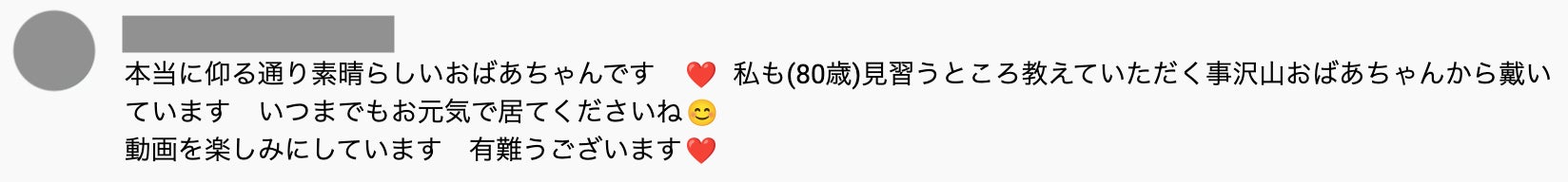 ひ孫:実は、ばあちゃんには提案せず、勝手に撮影して編集して投稿しました。ばあちゃんの娘に「ばあちゃんの日常を撮ってYouTubeやろうかな?」と話したら、「良いんじゃない、やってみな」と言われたので始めました。