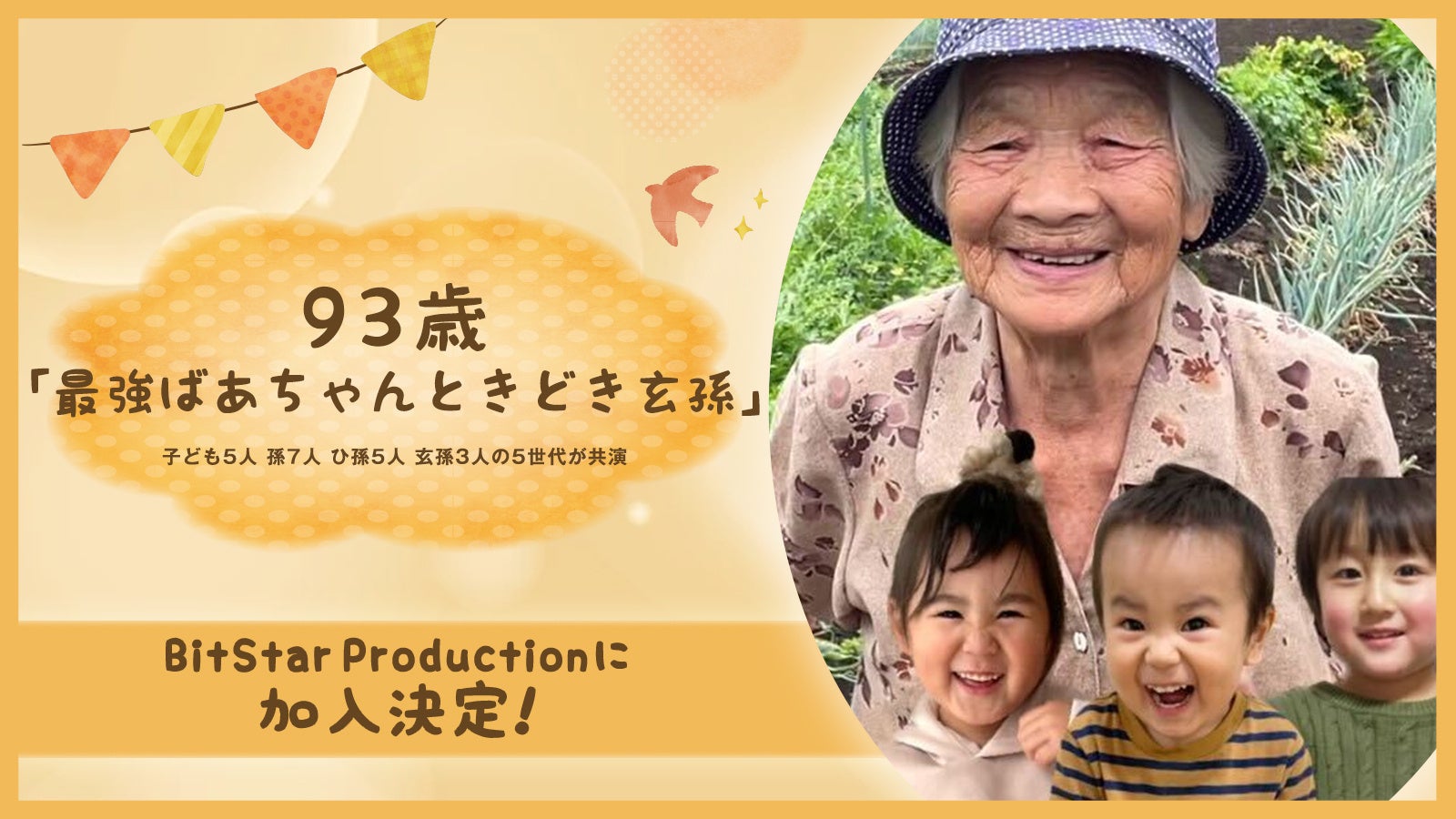 そんななか、300組以上のYouTuberやTikTokerが所属する「BitStarProduction」に最年長の93歳のYouTuber「最強ばあちゃんときどき玄孫」が加入いたしました。「最強ばあちゃん」の他、子5人・孫7人・ひ孫5人・玄孫(やしゃご)3人の5世代が共演するYouTubeチャンネルです。