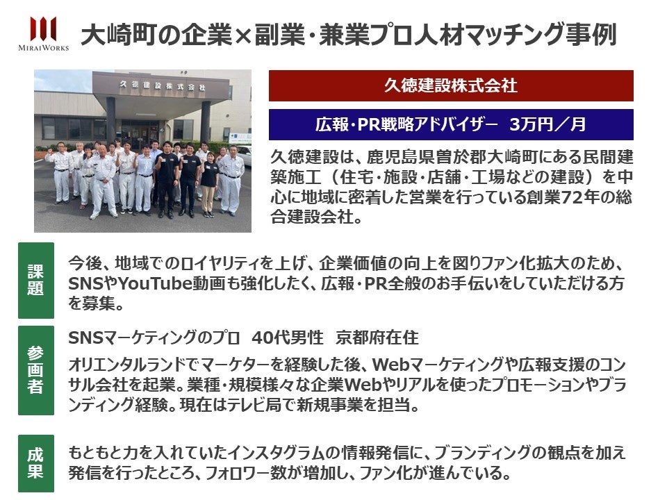 今年度も、当社は大崎町と都市部在住の副業・兼業プロ人材のマッチングを通じて、大崎町の地元企業が抱える問題の解決することで、地域企業の事業強化を目指します。