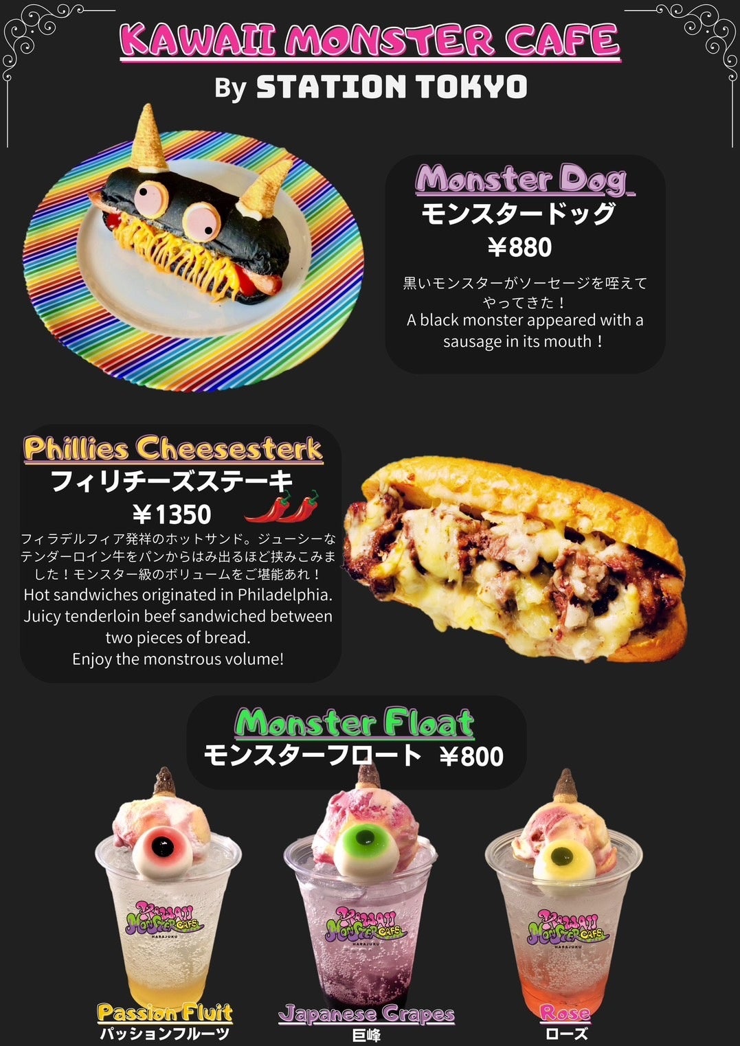 10月19日(木)〜22日(日)は、ホットドッグ専門店「HOTDOG CAFE STAND STATION TOKYO(ホットドッグカフェスタンド ステーション東京)」とコラボレーションしたフードを提供。モンスターがソーセージをくわえたクレイジーな「モンスタードッグ」、ジューシーなテンダーロイン牛とチーズをたっぷり挟み込んだモンスター級ボリュームの「フィリチーズステーキ」などの限定メニューが登場します。