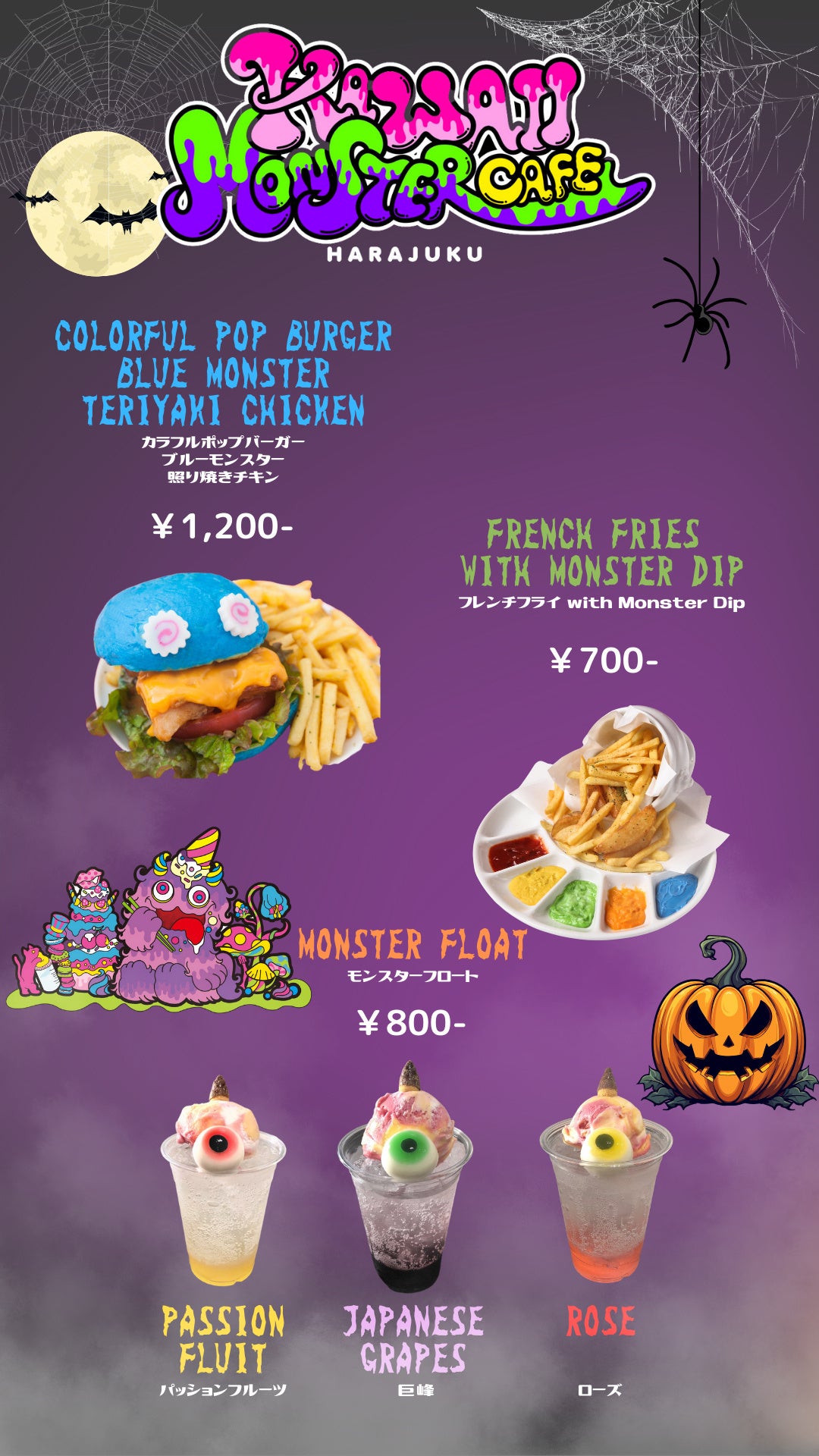 10月26日(木)〜31日(火)は、KAWAII MONSTER CAFEの人気メニューから「カラフルポップバーガー ブルーモンスター(照り焼きチキン)」、カラフルな5種類のソースで楽しめる「フレンチフライ with Monsetr Dip」を提供。また、会期中はちょっぴり不気味な「モンスターフロート」でハロウィン気分を味わえます。