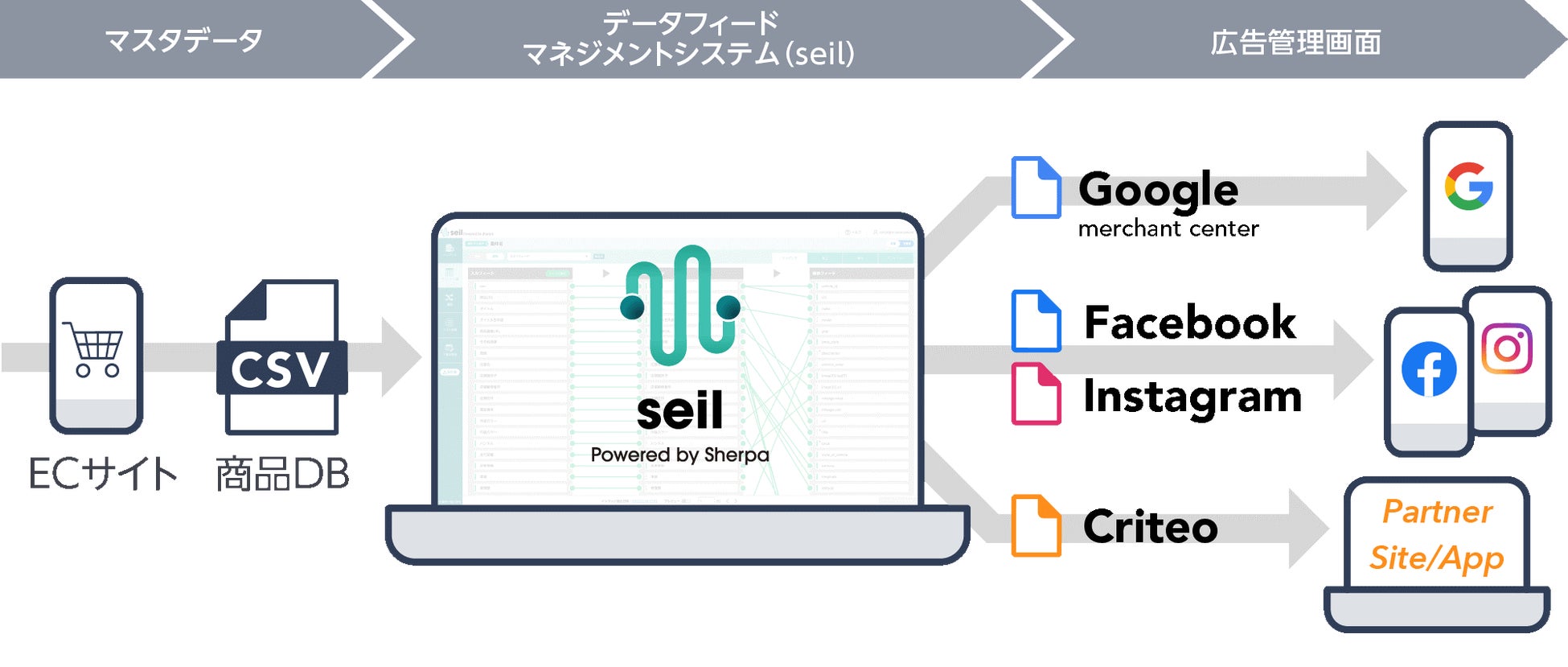 「seil Powered by Sherpa」は、自社ECの売上に寄与するダイナミック広告や各プラットフォームのショッピング機能を活用するにあたって必要となるデータフィードを自動生成するデータフィードマネジメントシステムです。専門のコンサルティングチームが対応することにより、広告配信のパフォーマンスを最大化します。