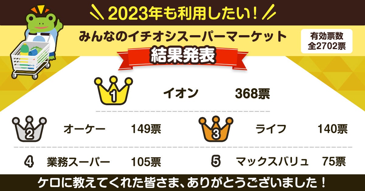 凸版印刷株式会社のグループ会社 株式会社ONE COMPATHが運営する国内最大級の電子チラシサービス「Shufoo!(シュフー)」は、Shufoo!ツイッター公式アカウント(@shufoonet)のフォロワーを対象に実施した「2023年も利用したい!『みんなのイチオシスーパーマーケット』」の結果を発表します。有効投票数2,702票の中から1位に選ばれたのは「イオン」でした。おめでとうございます!