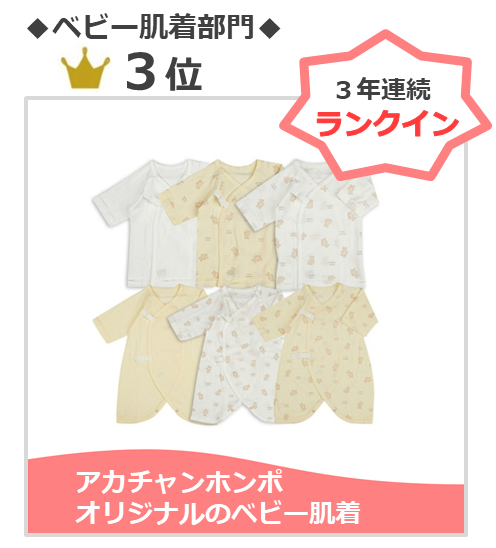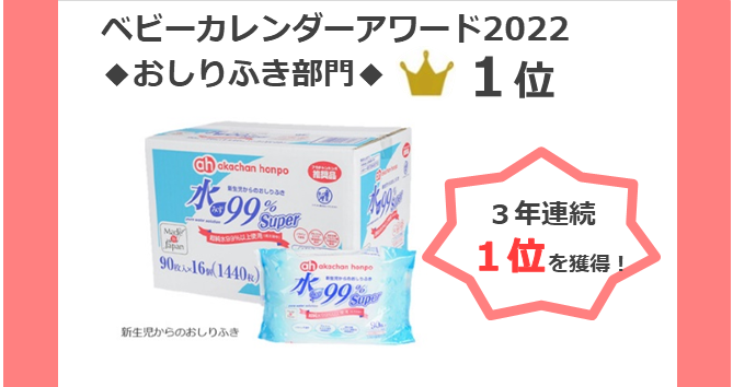 おしりふき部門 第1位「水99%Super シリーズ」、ベビー肌着部門 第3位「アカチャンホンポオリジナル ベビー肌着」が受賞しました。「水99%Super シリーズ」は、おしりふき部門において3年連続1位を獲得し、「水分量とコスパの良さ」で数多くの評価をいただきました。