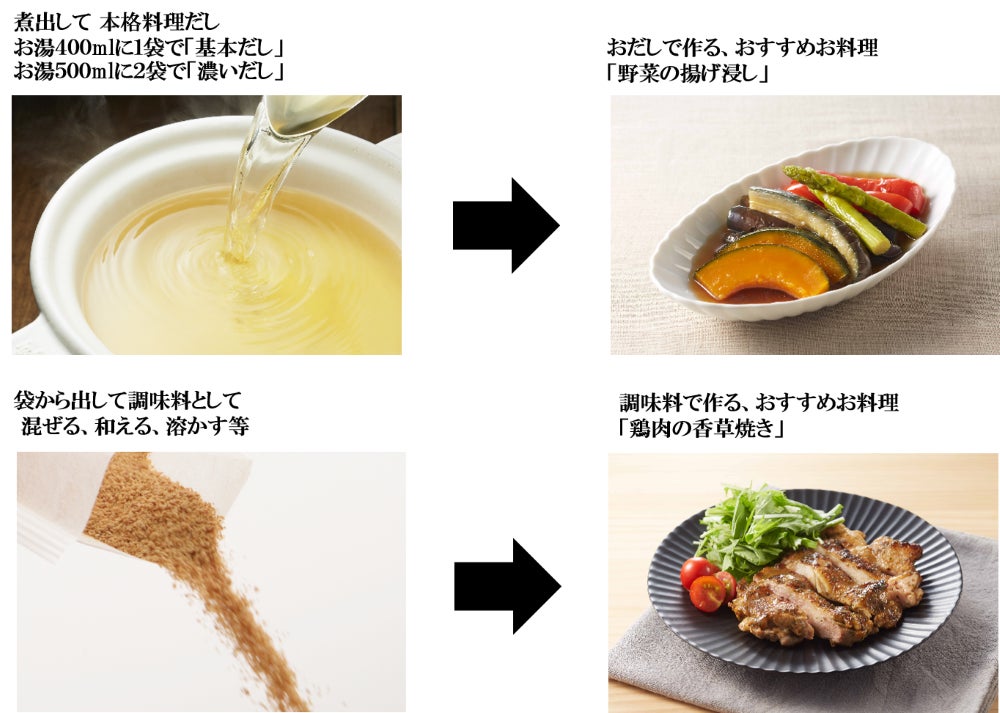 従来品同様に「だし」「調味料」として、1袋で2役の便利な使い方ができます。