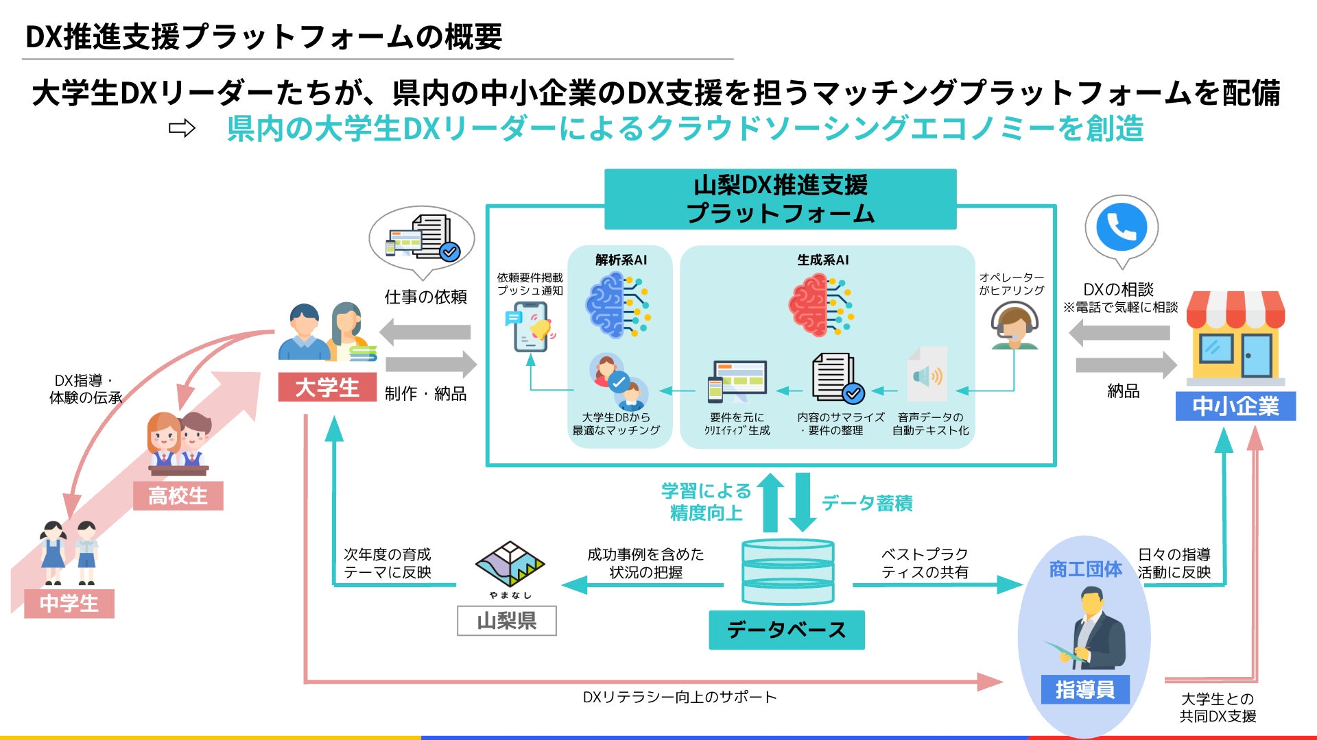 株式会社ライフイズテック(本社:東京都港区、代表取締役:水野雄介)は、山梨県と連携し、県内の中小企業のDX推進を支援するプラットフォーム「デジサポ!やまなし」を2025年3月よりスタートしました。本取り組みは、「山梨県DX人材育成エコシステム創出事業」の一環として、DXスキルを身につけた大学生が、県内の中小企業のDX推進をサポートする仕組みです。