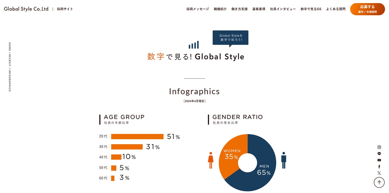 グローバルスタイルの社員の年齢・男女比率や売上推移などの情報を掲載しているページです。採用のエントリーをご検討されている方に、さらにグローバルスタイルの理解を深めていただくため、最新のデータを反映しております。