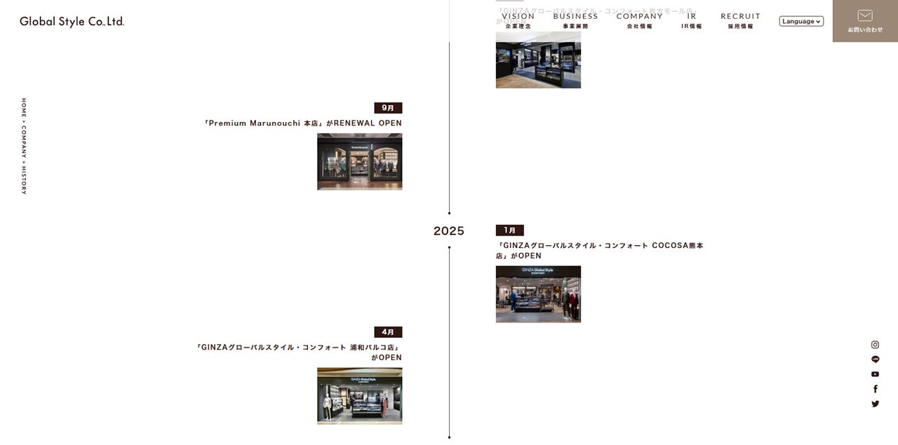 グローバルスタイルがこれまで歩んできた歴史を年表形式でご紹介しています。企業の成長過程をより正確にご覧いただくために、新店舗オープンなど最新の情報を追加しました。