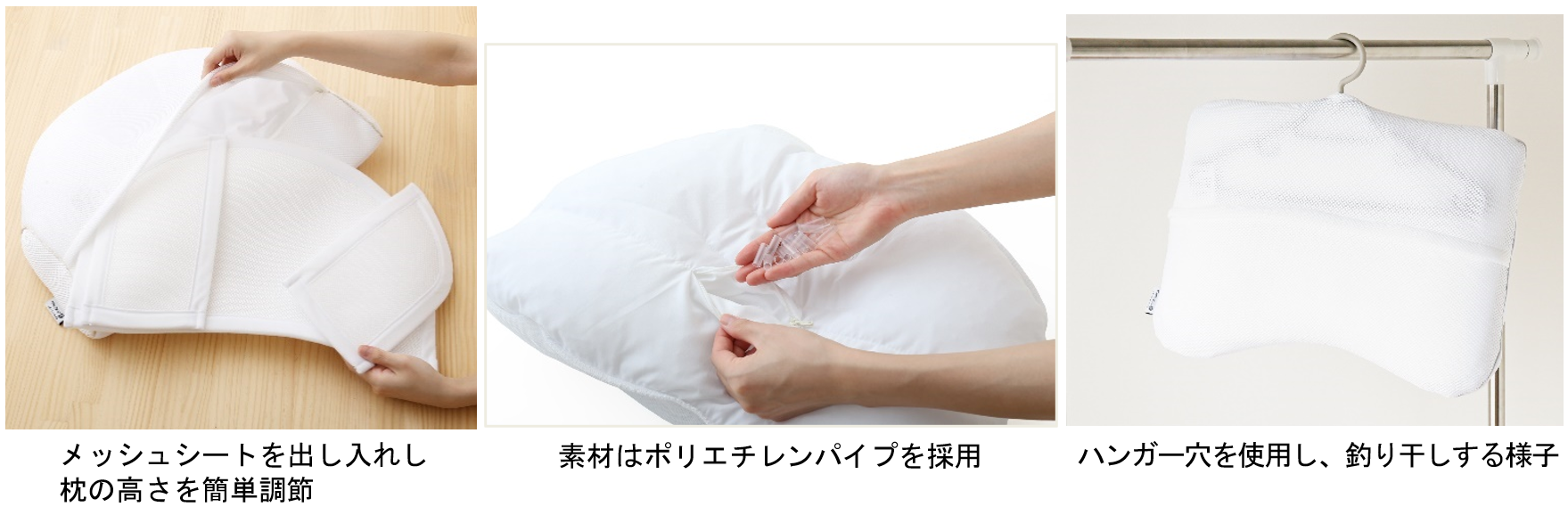 人は就寝中に一晩でコップ1杯程度の汗をかくと言われており、毎日使う寝具はカバーをつけていても汗を吸収してしまいます。毎日使う枕をいつでも清潔に保っていただけるよう、「deep sleep PILLOW」は寝心地と洗いやすさを考慮し、素材はポリエチレンパイプとしました。洗濯機で自宅で簡単に丸洗いができ、乾きやすい構造になっています。