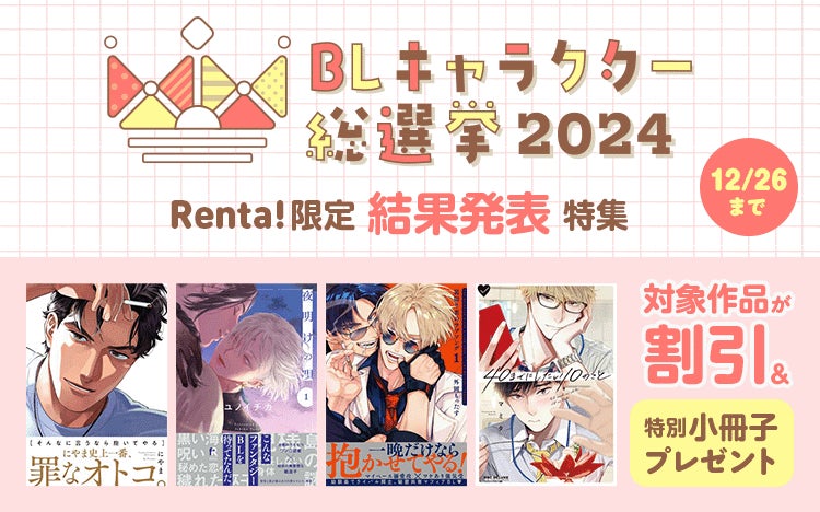 Renta!では受賞作品などの対象作品が割引・ポイント還元でお得に読める『Renta!限定 BLキャラクター総選挙2024結果発表特集』を掲載いたします。