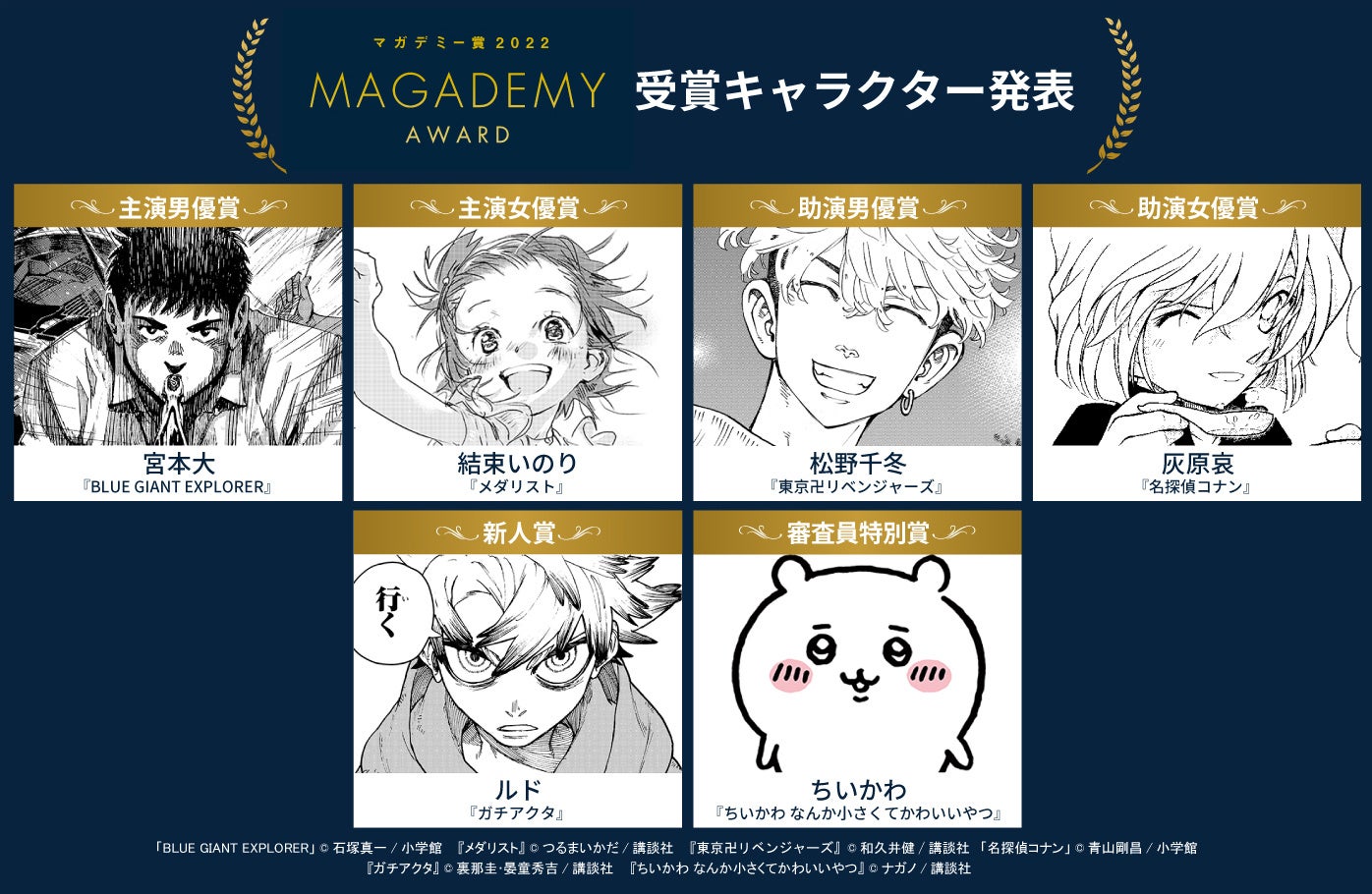 「マガデミー賞2022」では、<主演男優賞>に『BLUE GIANT EXPLORER』の宮本 大さん、<主演女優賞>に『メダリスト』の結束 いのりさん、<助演男優賞>に『東京卍リベンジャーズ』の松野 千冬さん、<助演女優賞>に『名探偵コナン』の灰原 哀さん、そしてこのたび新設された<新人賞>には『ガチアクタ』のルドさん、<審査員特別賞>には『ちいかわ なんか小さくてかわいいやつ』のちいかわさん、以上6名の受賞が決定いたしました。