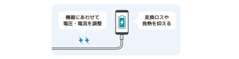 急速充電規格「PD(Power Delivery)」に加え、機器の状態にあわせて効率的に充電できる「PPS」にも対応。