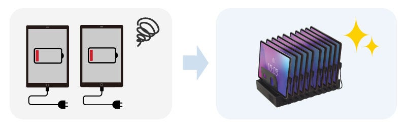 タブレットやノートPCを10台まとめて急速充電。保管中に充電できるため、必要な時にすぐ使用することができます。