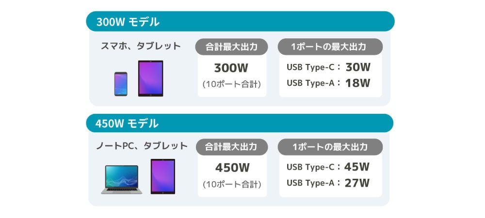 「300Wモデル」は1ポートあたり最大30W、「450Wモデル」は1ポートあたり最大45Wに対応。