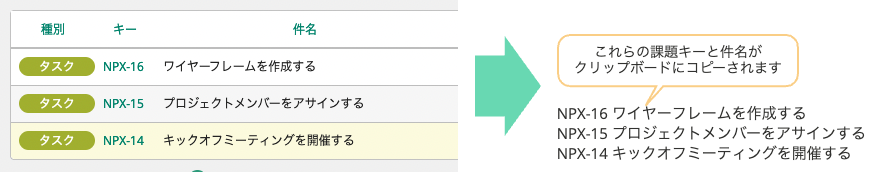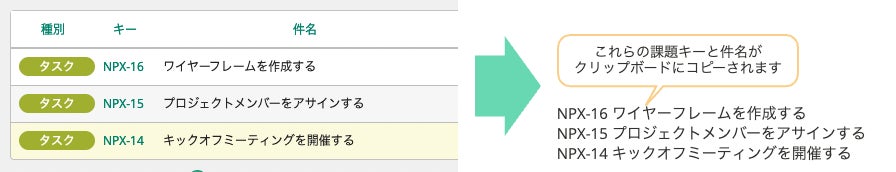 これまでは、表示中の課題の課題キーと件名を一件ずつコピーすることのみ可能でした。今回、一覧表示した課題すべての課題キーと件名をまとめてコピーできる機能をリリースしました。