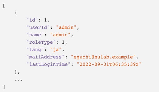 今回、ユーザー一覧の取得、ユーザー情報の取得などで得られるユーザー情報に、ユーザーの最終ログイン日時が含まれるようになりました。”lastLoginTime”の値が、ユーザーの最終ログイン日時です。