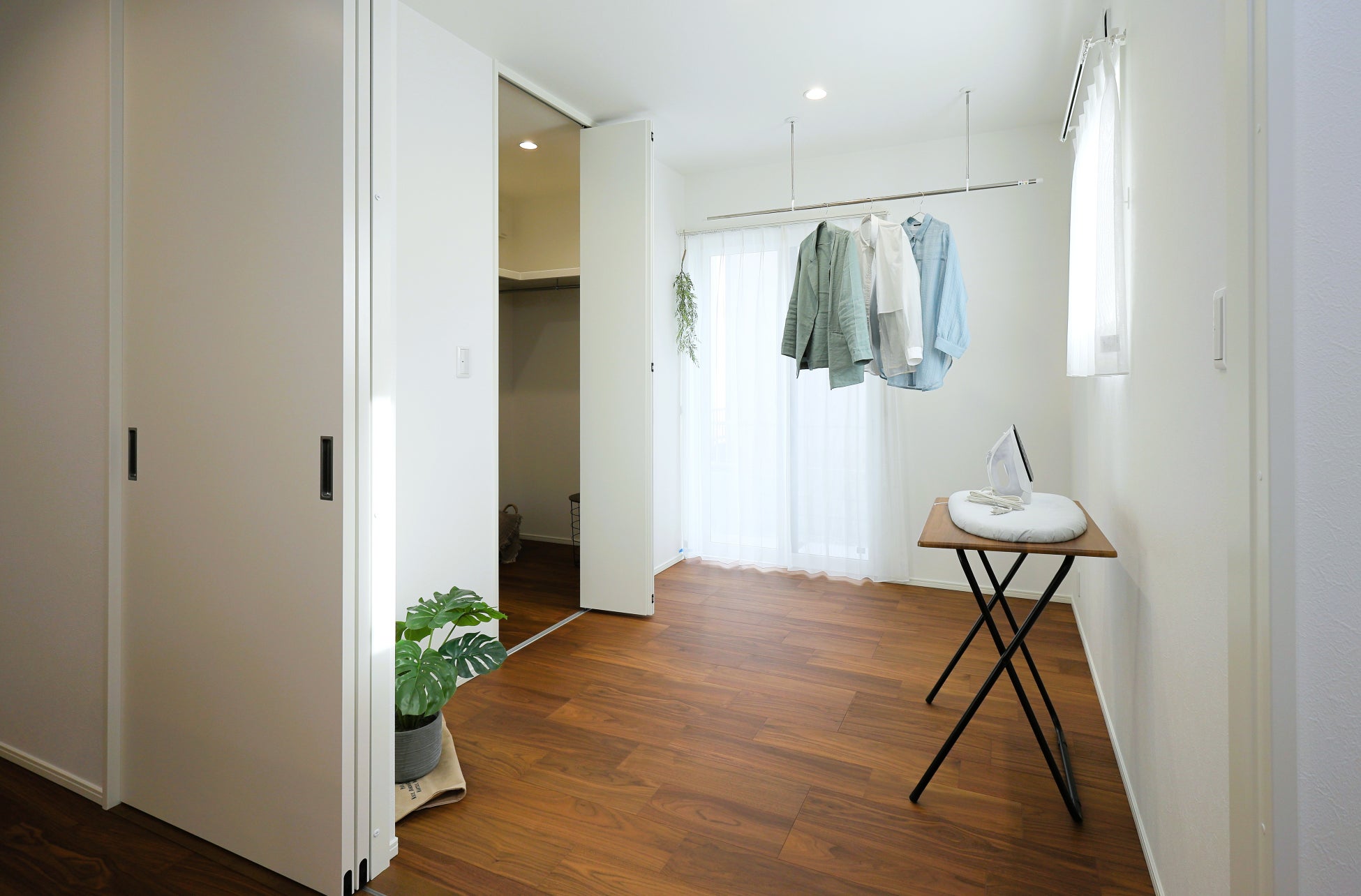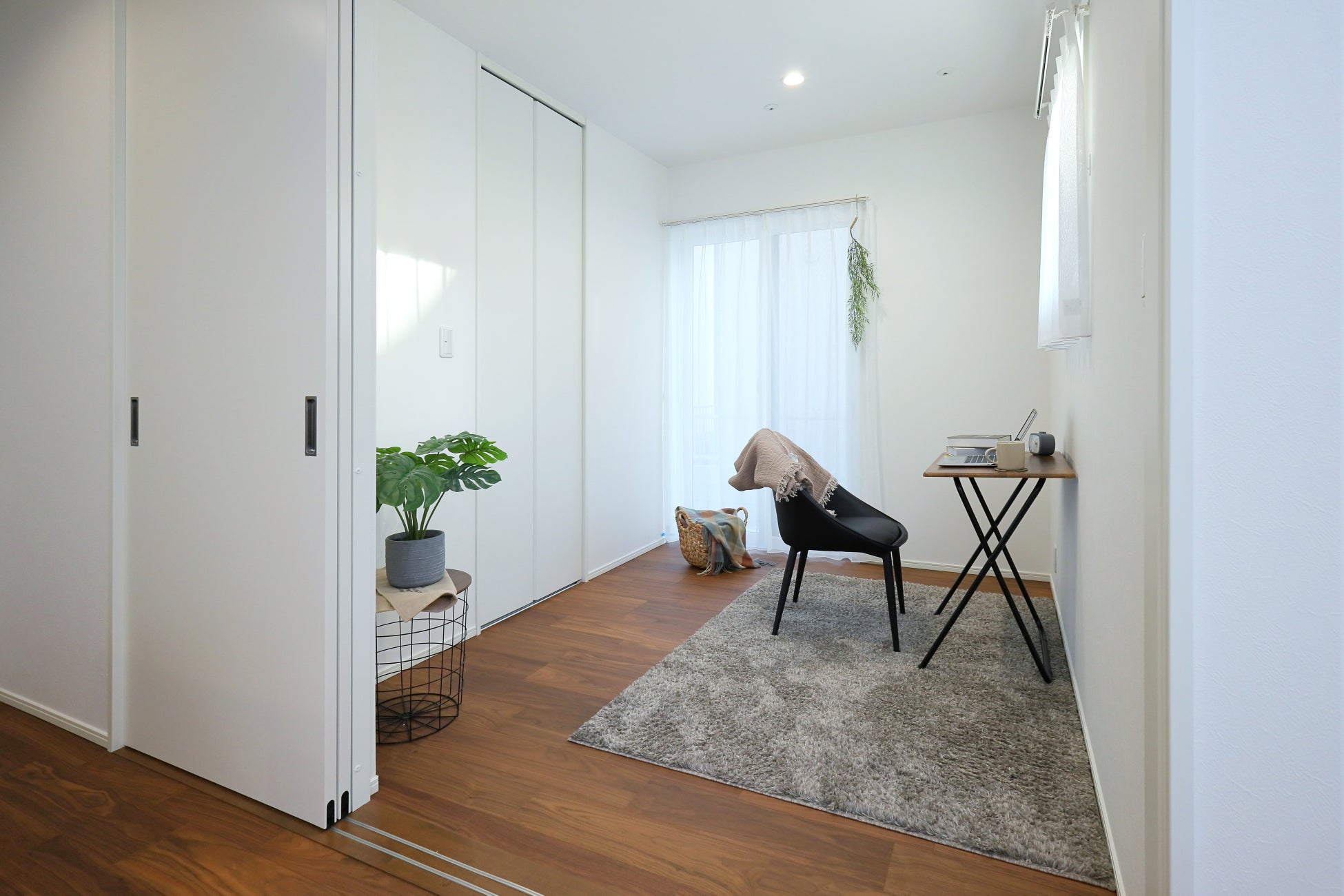 ニーズが多い“1階の個室”を採用した分譲住宅です。「マルチスペースCOCO」では、ただ単に1階に個室を設けるのではなく、一緒にウォークインクローゼットを備えることで個室の汎用性と使いやすさを高めます。そして、間仕切り建具に引き戸を採用することによって、開放して広々としたLDK空間としても、閉めてランドリールームや書斎など個室としても、フレキシブルに空間を使うことができます。
