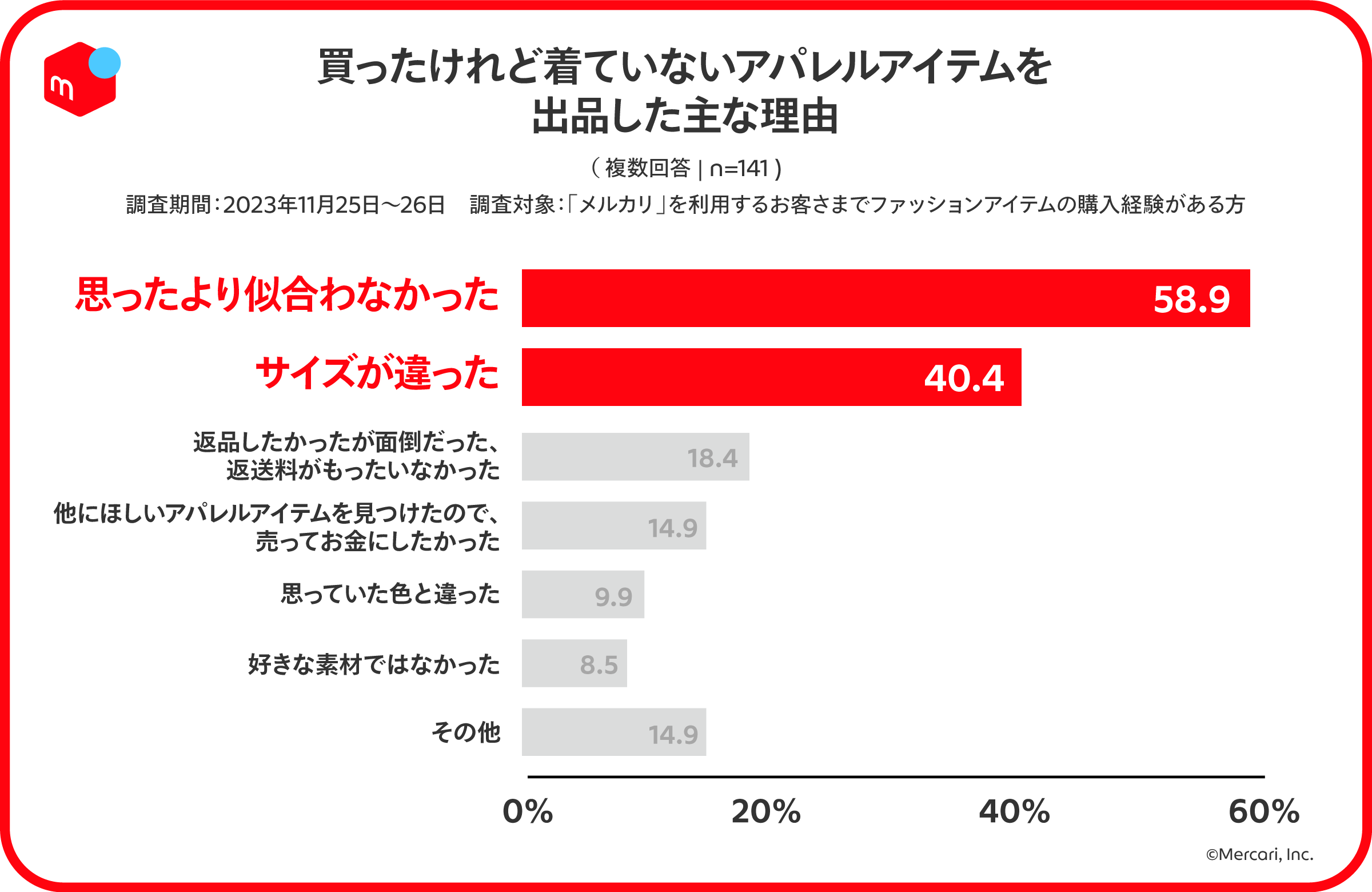 また、同調査で「メルカリ」でファッションアイテムを販売したことがある人のうち、約62.4%が「買ったけれど着ていないファッションアイテムを保有している」と回答し、購入後着用していない理由として「思ったより似合わなかった(約58.9%)」「サイズが違った(約40.4%)」が挙げられました(※9)。購入時に想定していたイメージと異なり、商品が不要になったことが出品の動機に繋がり、その結果、「メルカリ」では比較的状態の良い「新品・未使用」や「未使用品に近い」などのアイテムが多く取引されていると考えられます。