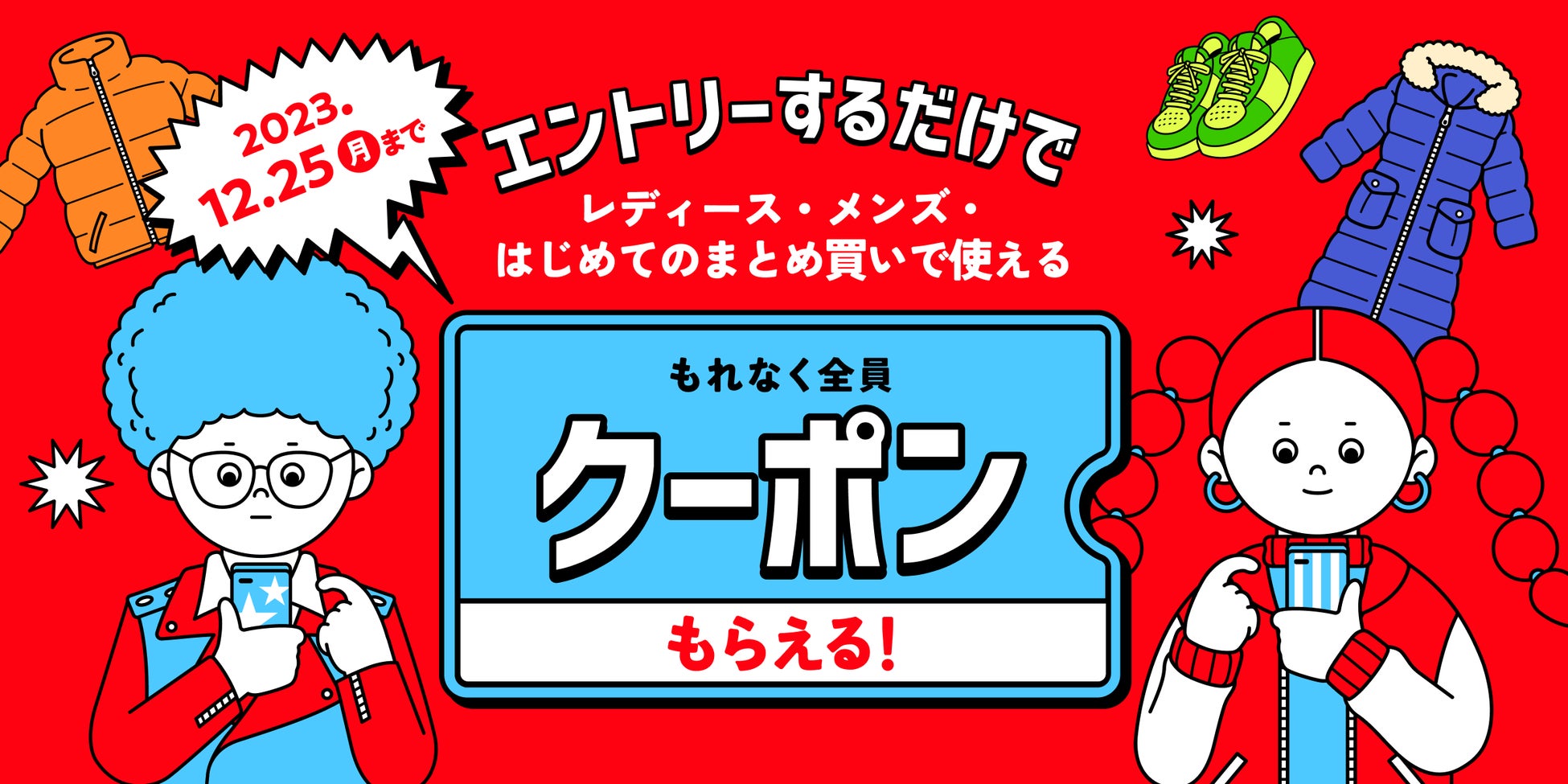 キャンペーン期間中に「エントリーする」ボタンをタップした方へ、1週間以内にクーポンを付与します。クーポンの種類は以下の通りです。もらったクーポンを使って「レディース」「メンズ」または「まとめ売り」カテゴリーに出品された商品を購入すると、以下の通り値引きされます。