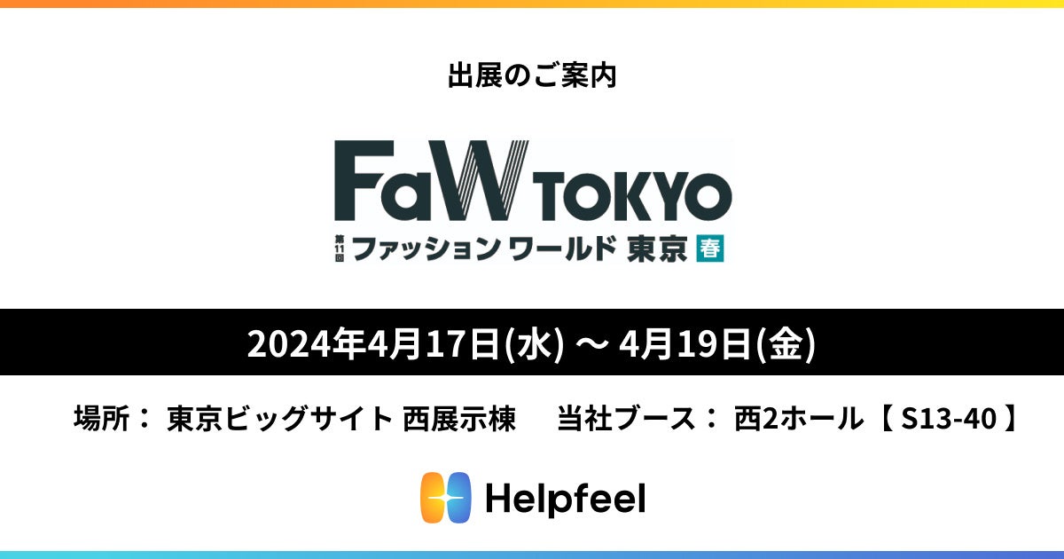 株式会社Helpfeel(京都府京都市、代表取締役/CEO:洛西 一周、以下「当社」)は、2024年4月17日(水)〜4月19日(金)に東京ビッグサイトで開催される日本最大級のファッション展示会「第11回 ファッションワールド 東京(FaW TOKYO)2024 春」に出展することをお知らせします。