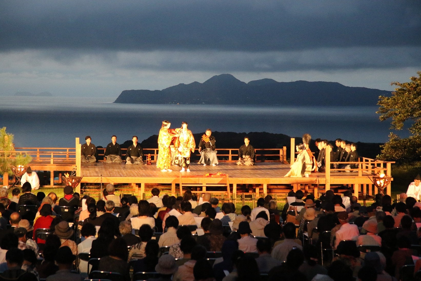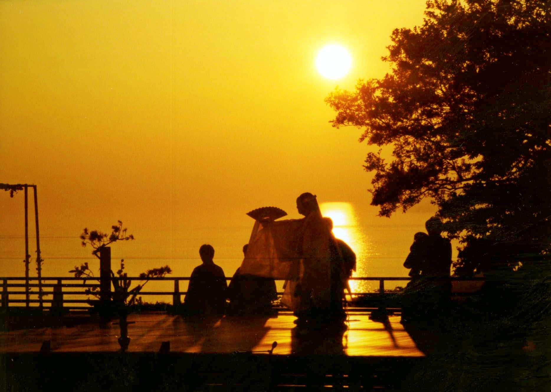 豊臣秀吉公は、名護屋で十番の能をおぼえたと伝えられており、秀吉公が城から見ていた玄界灘に沈む夕日をバックに能が舞われます。夕闇の中、薪の光に照らされた演者達の姿と能が持つ厳かな世界観をぜひご堪能ください。