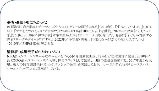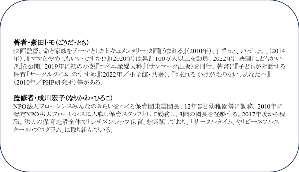 豪田トモ監督は、映画『こどもかいぎ』の製作を通して、幼少期からの「対話」の可能性や大切さを実感。保育者の皆さんの「こどもかいぎ」の実践方法やコツを知りたい!という声を受け、【いつでも、どこでも、誰でも】『こどもかいぎ』をしていただける書籍化が実現しました。加えて、本著では、膨大な取材に基づいた、保育者の皆さんとこどもたちの関係づくりや、スタッフ間や保護者との人間関係、家庭内でのコミュニケーションにも言及!こどもたちが「対話」や「話し合い」を楽しむことは映画で実証済みです。皆さんも「こどもかいぎ」を始めてみませんか?