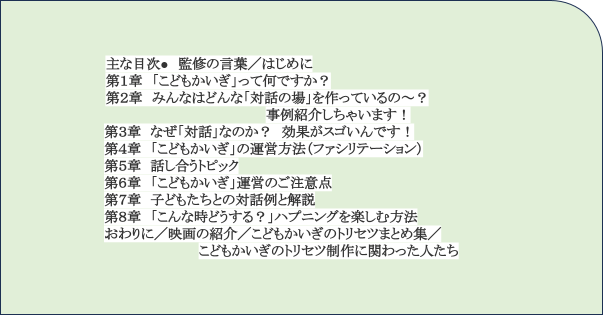映画『こどもかいぎ』とWEB版の「こどもかいぎトリセツ」の製作を通して、コミュニケーションや保育・教育、脳科学などの専門家たちの知見もミックスした、「トリセツ」(マニュアル?ハウツー集?)を編み出しました。どんなことから取り組めばよいか、始め方や終わり方、トピックの選び方、うまくいかないときの対処法、注意点、ハプニングの楽しみ方など、わかりやすく、楽しくお伝えします。対話活動に取り組んでいる園の事例や、実際の子どもたちの対話例など、実際のイメージもよくわかります。