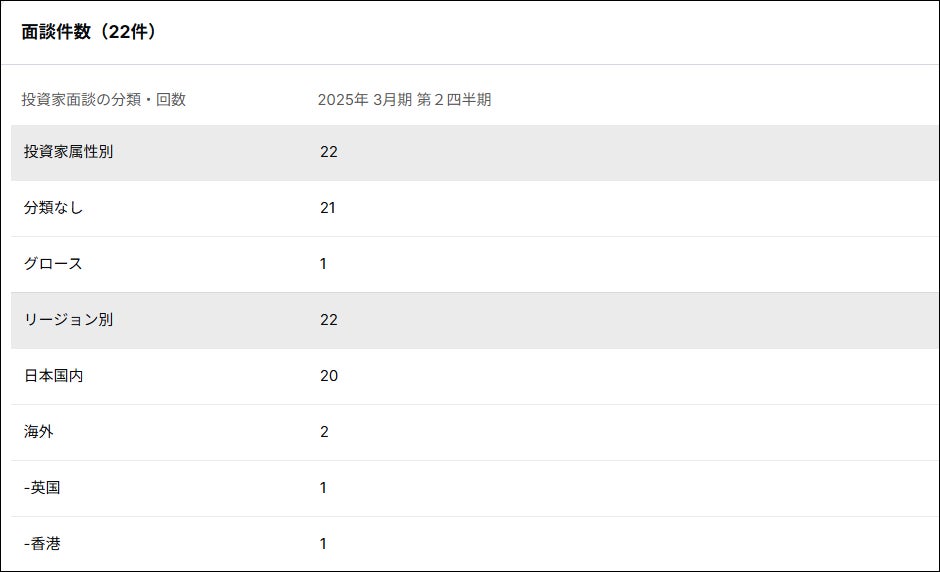 IR面談の件数、国内・海外の地域別の比率、バイサイド・セルサイドの面談比率、ミーティングの規模別(1on1、スモール、ラージ)、形式別(対面、Web等)を集計する機能が実装されました。