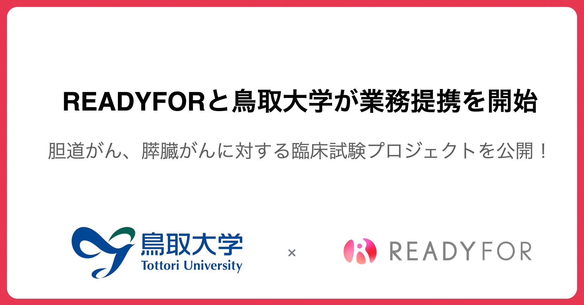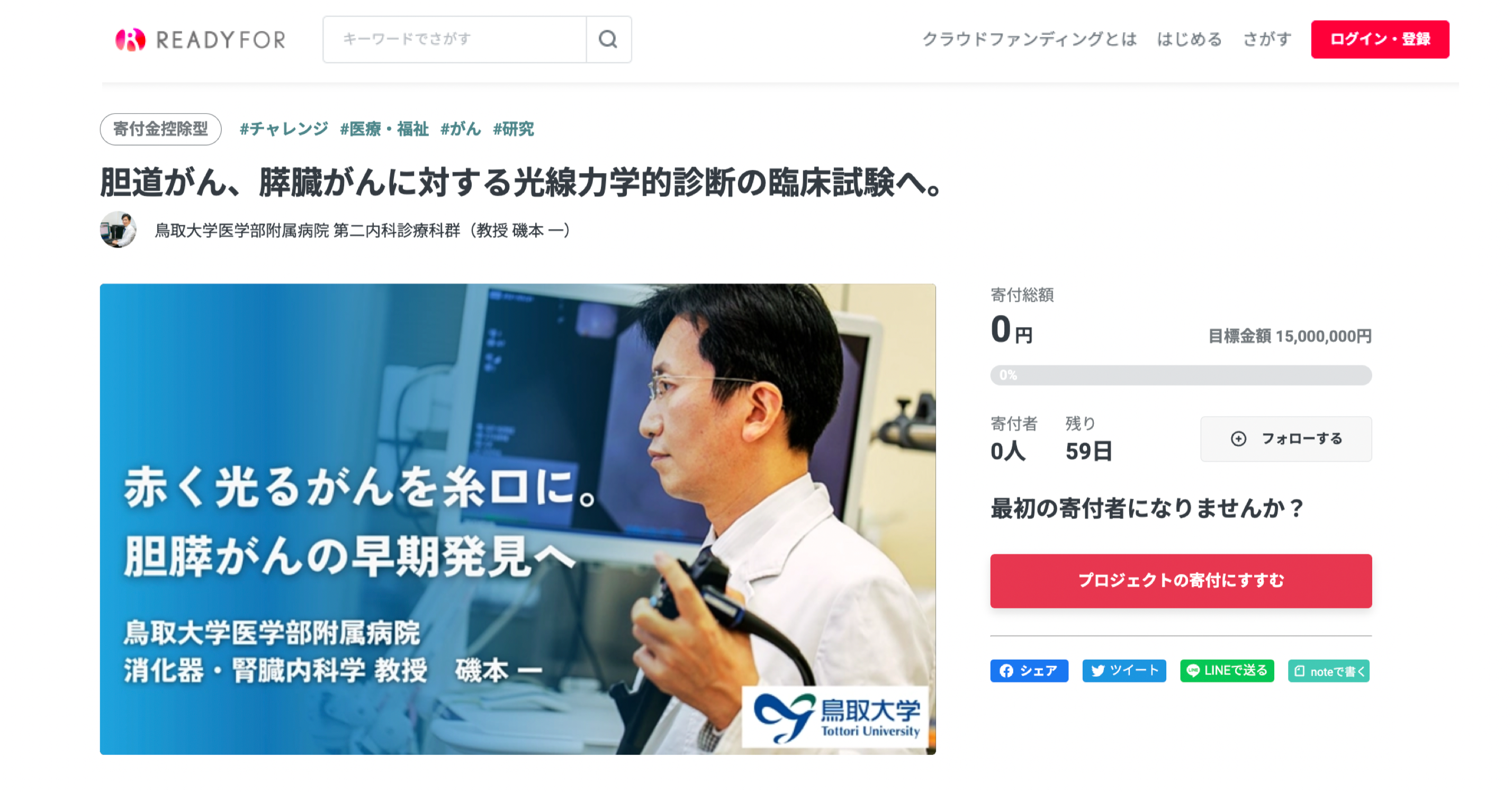 日本初・国内最大級のクラウドファンディングサービス「READYFOR」を運営するREADYFOR株式会社(本社:東京都千代田区、 代表:米良はるか)と国立大学法人鳥取大学(所在地:鳥取県鳥取市、学長:中島廣光)は業務提携を開始し、本日、提携第一号としてクラウドファンディングプロジェクト「胆道がん、膵臓がんに対する光線力学的診断の臨床試験へ。」を公開いたしました。