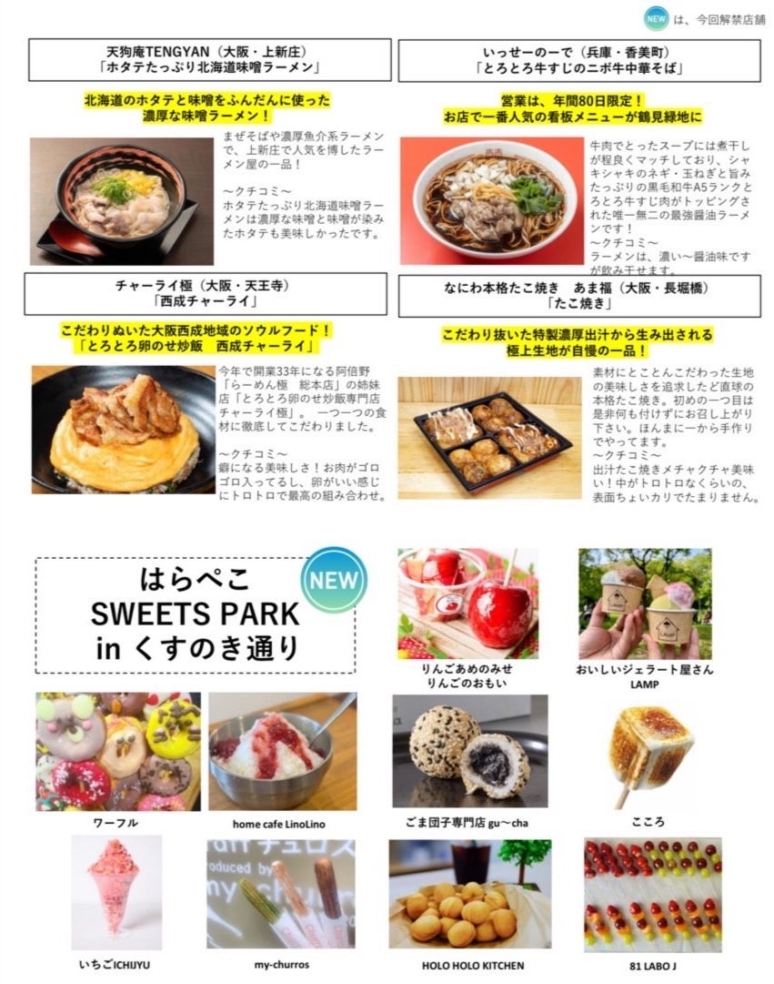 メイン会場となる大芝生エリアには36店舗の飲食店が、公園内くすのき通りの「はらぺこSWEETS PARK」には10店舗のスイーツが集結。メニュー詳細は、イベントHPにて。お目当てのグルメを、是非ご賞味ください!