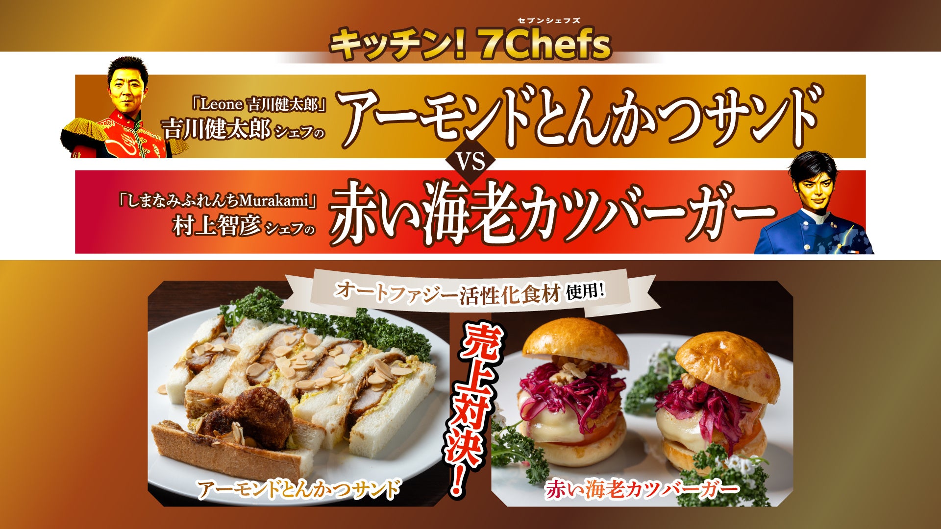 料理エンターテインメント番組「7Chefs」からは、健康×おいしさを追求したオートファジーをテーマに、イベント限定メニューが出店。番組でおなじみ吉川健太郎シェフ(「Leone 吉川健太郎」)による「アーモンドとんかつサンド」と、村上智彦シェフ(「しまなみふれんちMurakami」)による「赤い海老カツバーガー」の売り上げ対決が繰り広げられます!