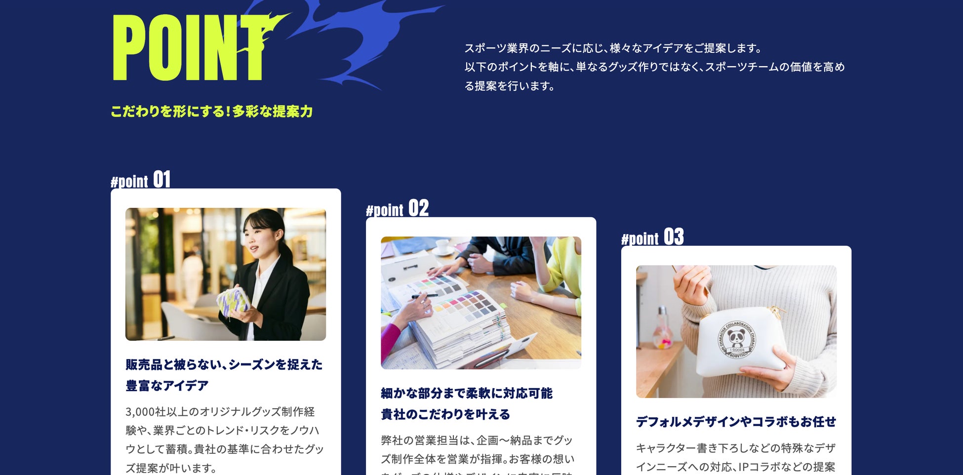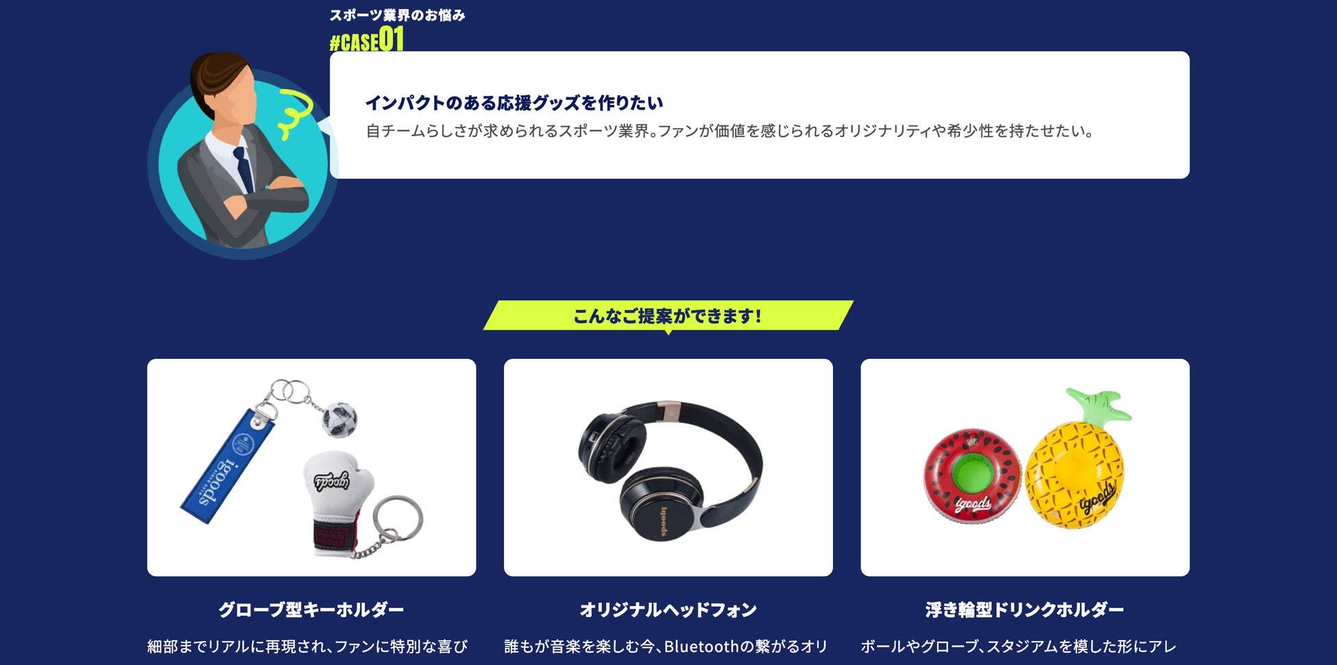 そこで、スポーツ業界特有のグッズ制作における「チームの一体感を演出できる応援グッズを制作したい」「ファンクラブ特典のアイディアが思いつかない」「ファンを惹きつける特別感のあるものを作りたい」などの課題に対し、当社だからこそ提供できるノウハウがあるのではないかと考え、業界別専門ページを公開する運びとなりました。