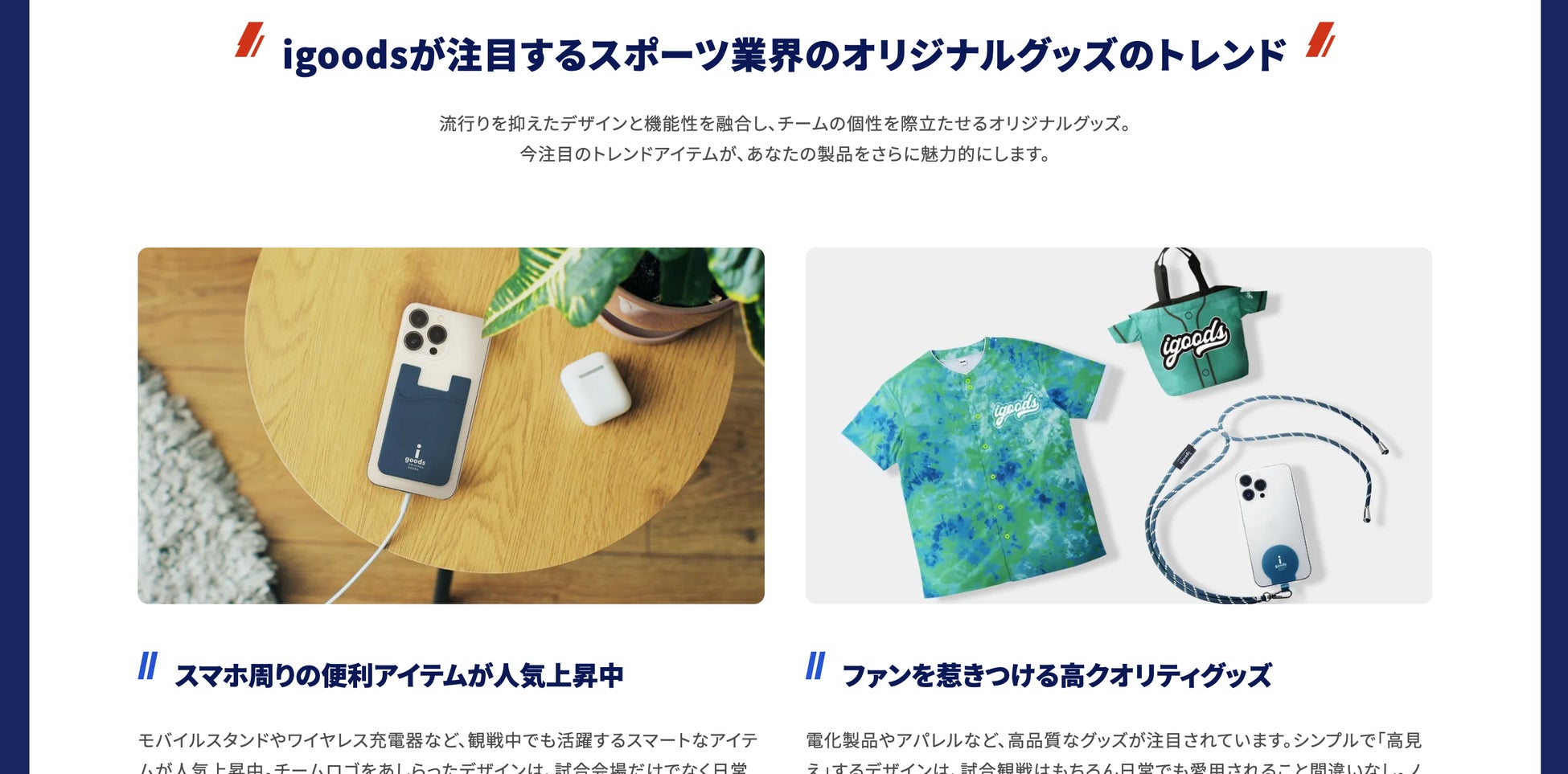 オリジナルグッズを企画制作するアイグッズ株式会社(本社:東京都渋谷区)は、2025年3月、スポーツ業界向けオリジナルグッズ・OEM制作のアイディアページを公開しました。豊富なグッズアイディアや業界トレンド情報などを掲載しており、スポーツチームの販促担当者様へグッズ制作のヒントを提供します。