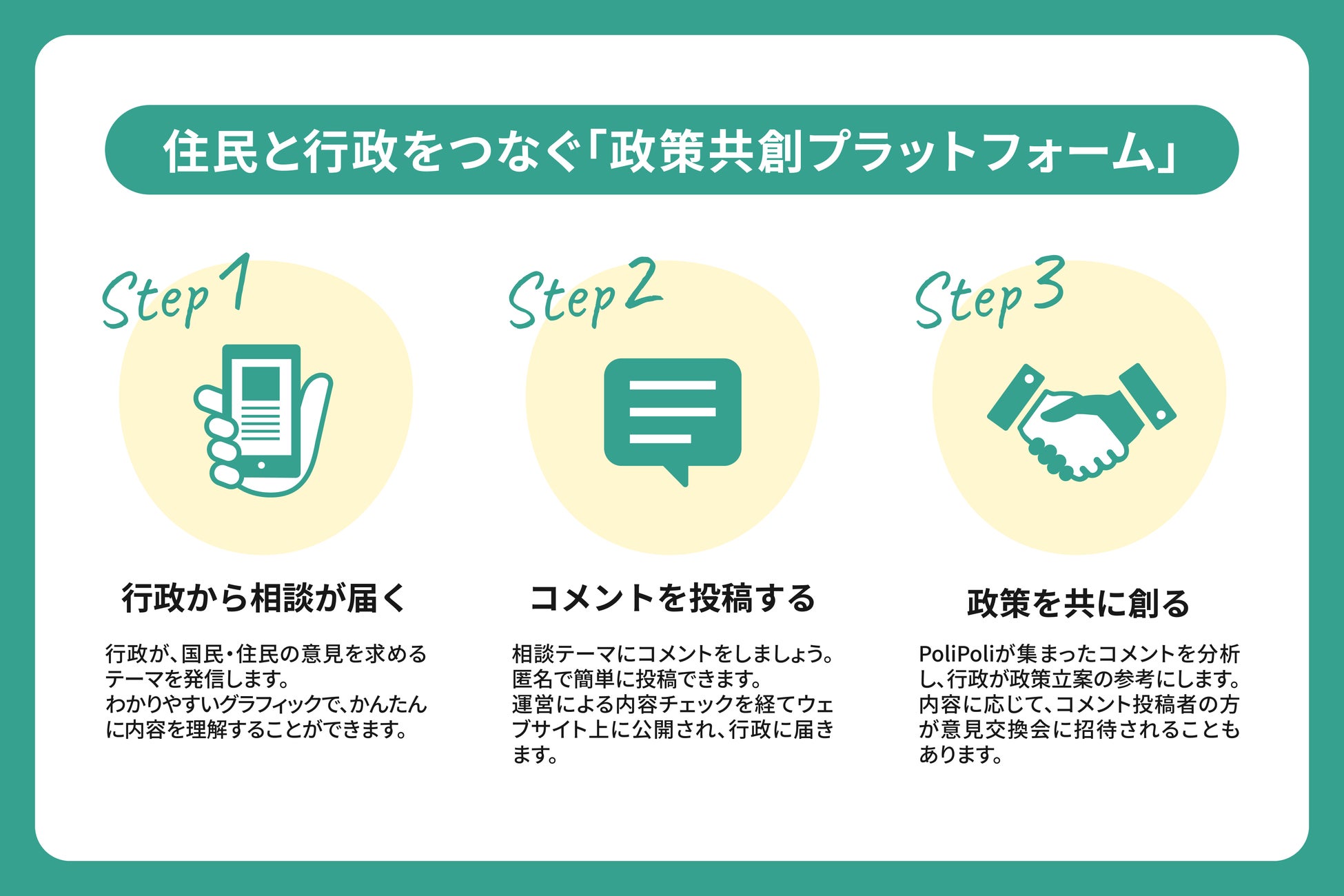 住民と行政が共に社会を創るための「政策共創プラットフォーム」です。誰もがオンラインで気軽に、アイデアを行政に届けることができます。国民や住民の行政に対する意見や要望を聴く活動(=広聴)をデジタル時代に対応した新たな仕組みへアップデートし、一人ひとりの幸せな暮らしに貢献します。