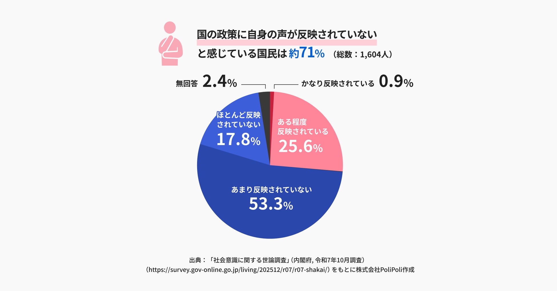 日本は自らの意見が社会に反映されていないと感じる国民が7割以上と高い水準になっています。この課題を解決するためには、誰でも気軽に行政との仕組みづくりに参加できるツールが必要です。サービス提供を通じて、住民と行政が共に政策を創る「政策共創」ができる社会を目指しています。