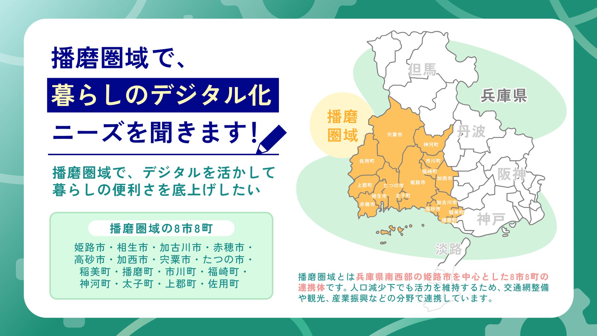 「私たちの生活を便利にするデジタルサービスは?」をテーマに、播磨圏域の8市8町の住民から、デジタル化してほしいサービスに関するコメント募集