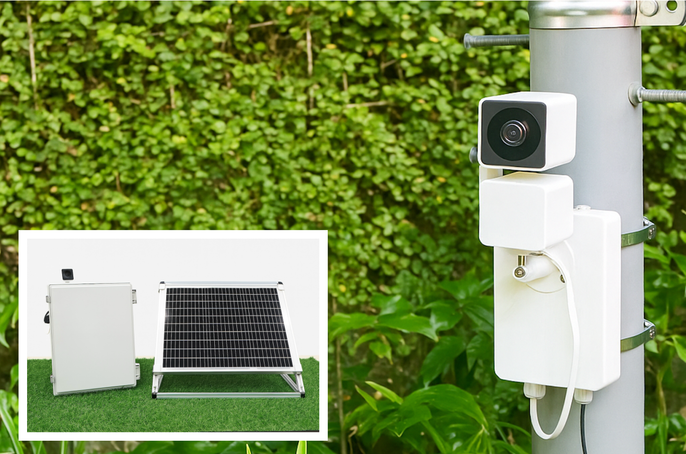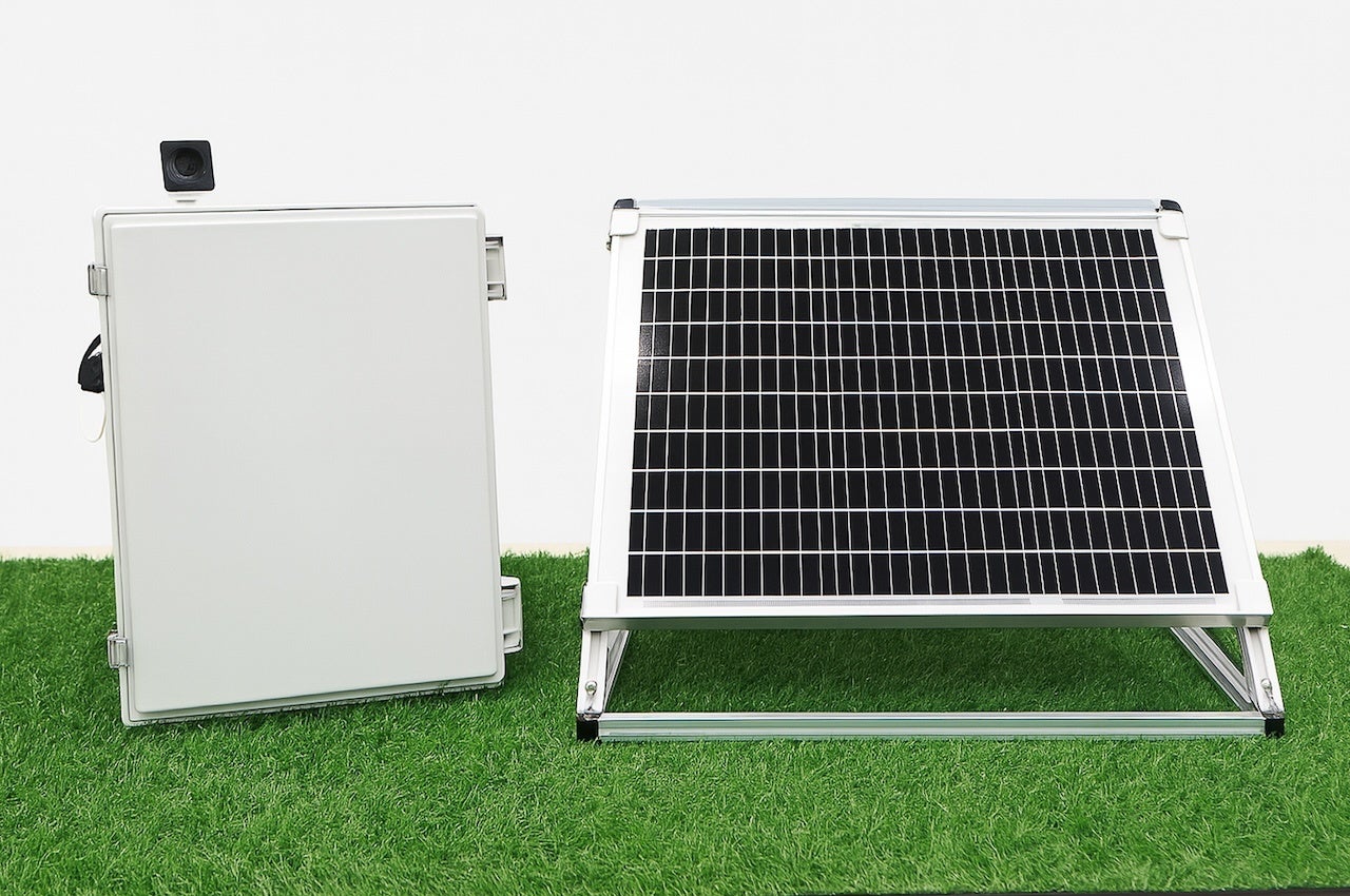 ソーラーパネルと充電バッテリー、通信ルーターと大容量アップロード通信SIMのセットです。屋外や電源・通信環境が整っていない場所でも、ソラカメが利用できます。