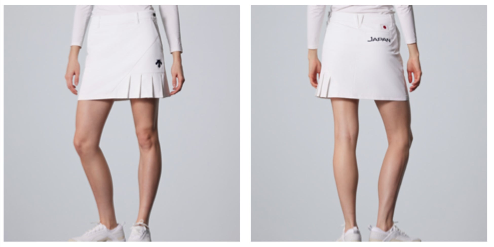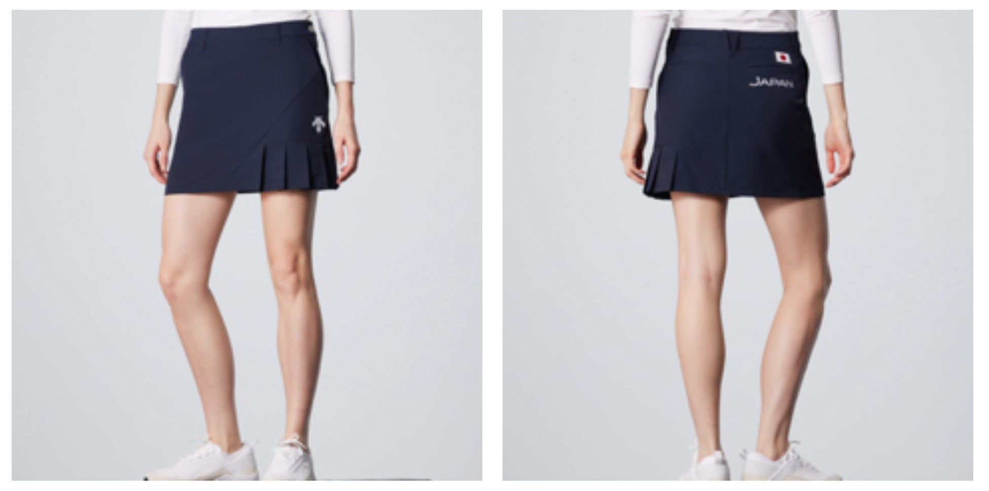 春夏シーズンに求められる機能性を備えた「神白」素材を使用したスカートです。前身左側に『デサント』のロゴ、後身右側ポケット下にJAPAN、後身右側ポケット上に日の丸の刺繍をしております。左サイドのプリーツがフェミニンさを演出、ハイウエストで腰位置を高くし、脚がすらっと長く見えるようにデザインしています。