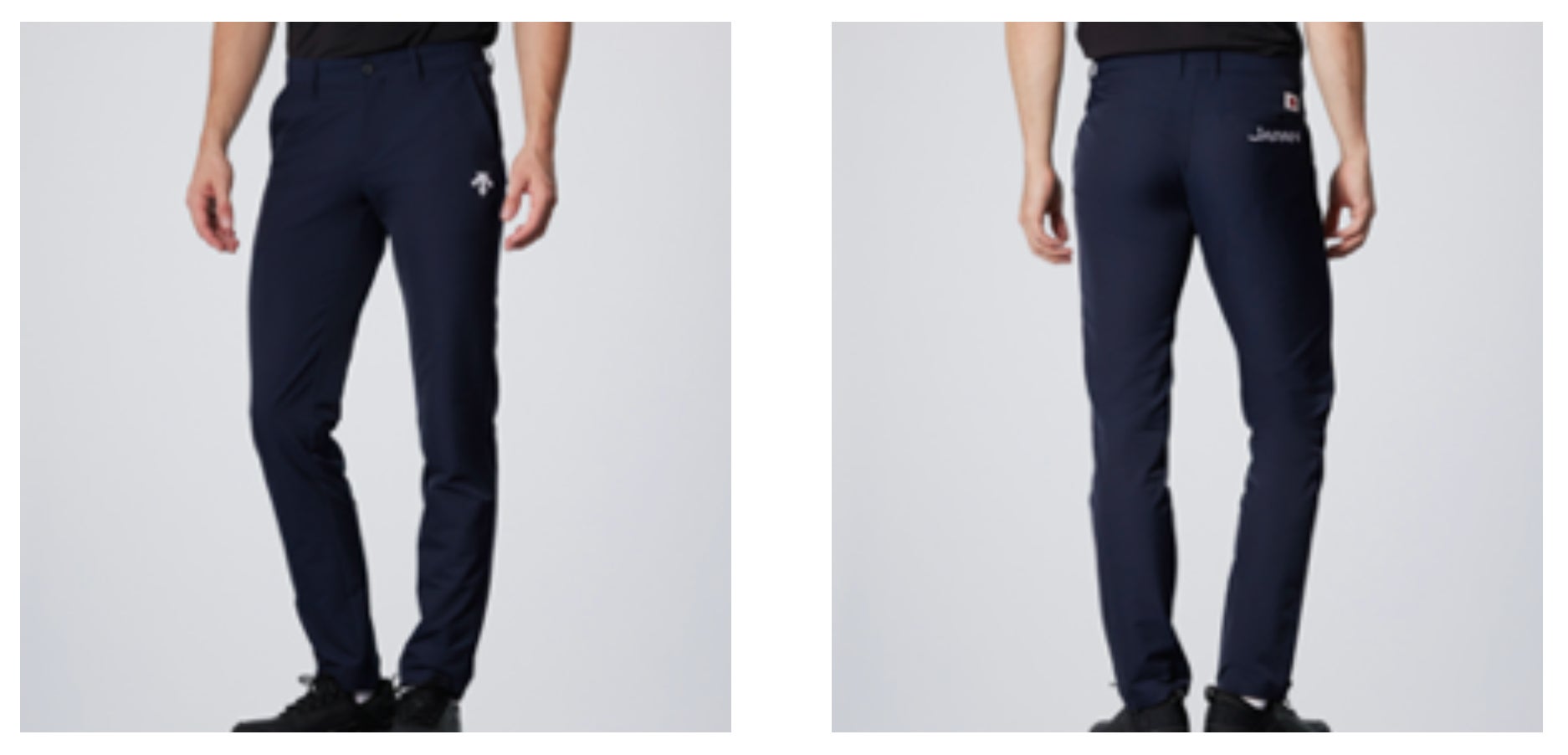 前身左側に『デサント』のロゴ、後身右側ポケット下にJAPAN、後身右側ポケット上に日の丸の刺繍をしております。シンプルで美しいスラックスのシルエットとなっています。