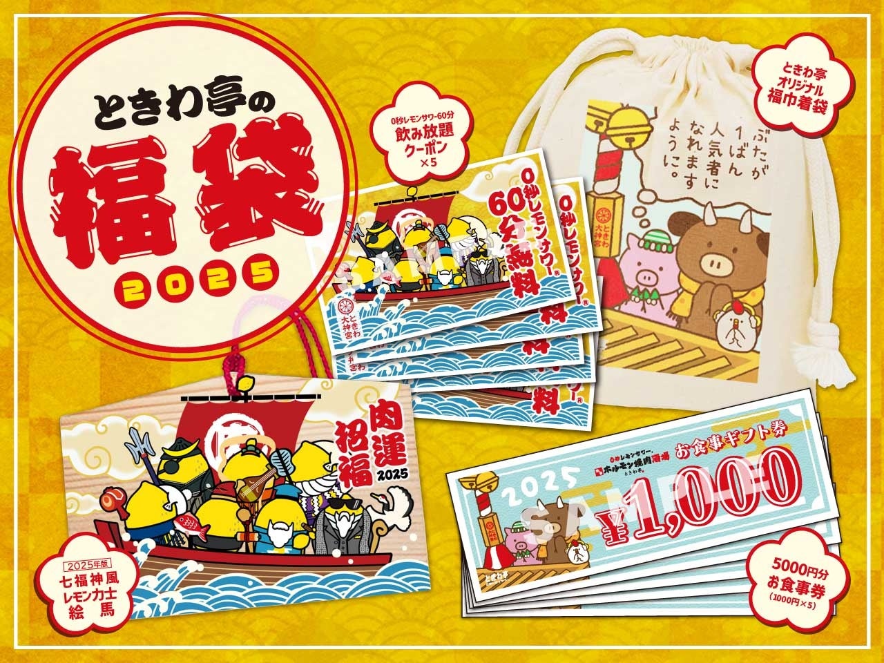 この度、2025年もときわ亭を楽しんでいただけるお得な『ときわ亭の福袋』を店舗・数量限定で販売します。ときわ亭オリジナルの福巾着袋に、5千円分のお食事券、「0秒レモンサワー」60分飲み放題(通常税込550円)クーポン5枚、オリジナルデザインの七福神風レモン力士絵馬が入っています。年末年始の特別企画で、ときわ亭として福袋を発売するのは今回が初めてです。