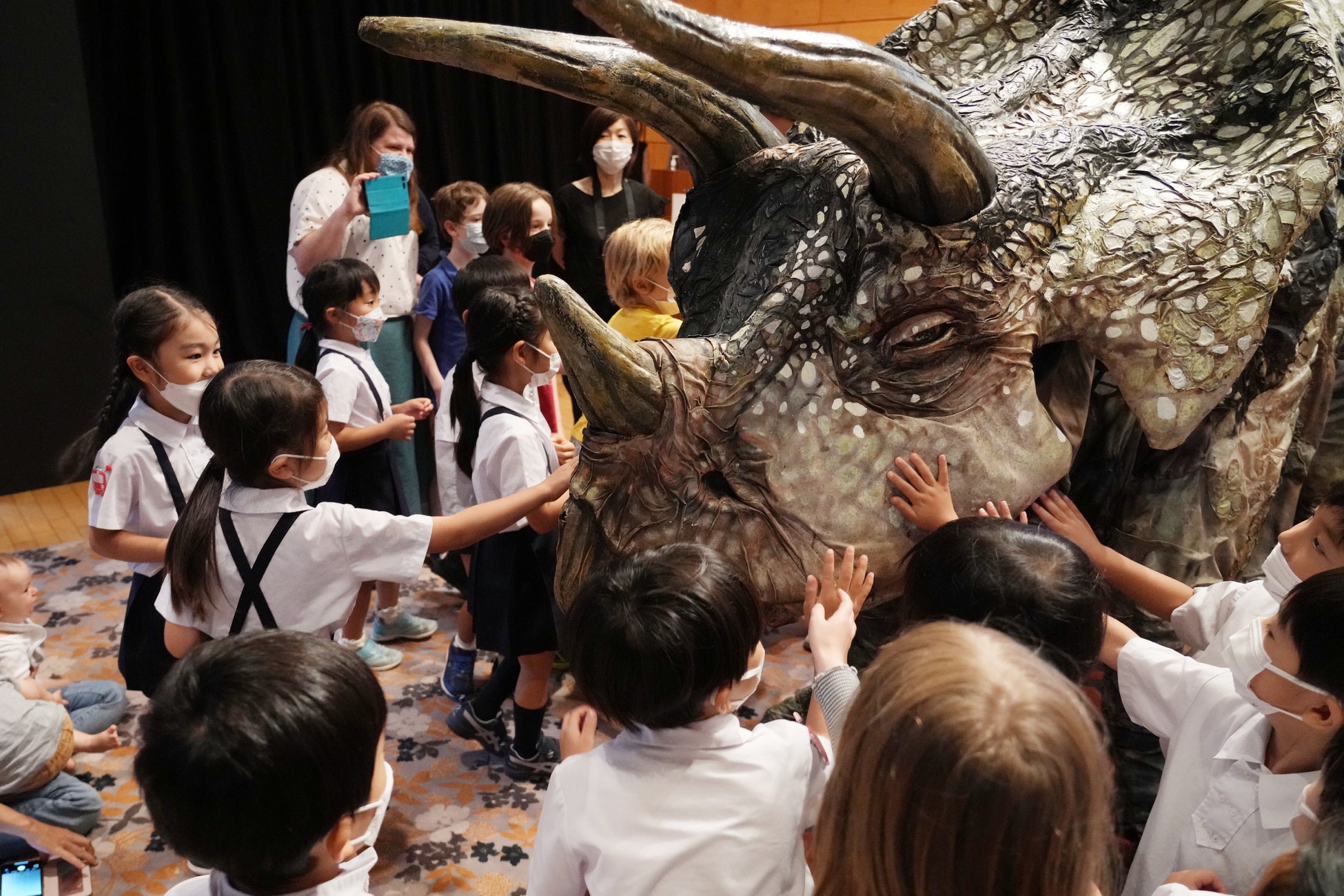 マスコミ向けに公開された回は、20名ほどの幼稚園児を招いて、これまでの「恐竜パーク」の内容が感じられる映像や、恐竜研究家の恐竜くんによる、恐竜にまつわるクイズを実施。さまざまな角度から恐竜と「恐竜パーク」への知識を楽しく学んだところに、飼育員に抱えられた赤ちゃん恐竜が登場。その愛らしい姿を前にした子どもたちのワクワクした様子が、こちらにも伝わってくるほどでした。続いて、今年の「恐竜パーク」で登場予定のトリケラトプスが会場に現れると、その迫力と動きに、園児たちの目線が釘付けに。本来の「恐竜パーク」では、恐竜に触ることはできませんが、この日は特別に、実際に恐竜に触れることが出来、トリケラトプスから離れない子供たちの様子が印象的な一幕となりました。