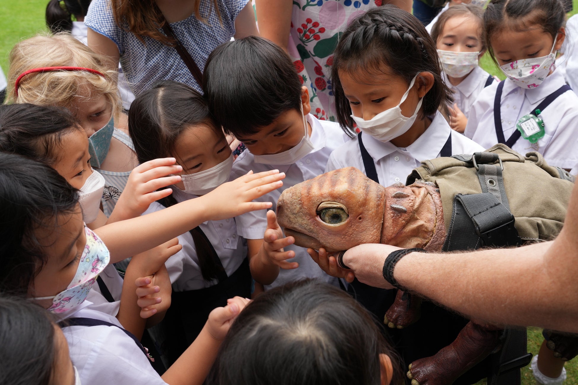 マユ「先ほど恐竜くんが表情のことをおっしゃっていましたが、Erthはそこを本当に大切にしていて、中に入るパペティアによって恐竜の性格も変わったりするんです。今年は二人、オーストラリアからもパペティアの女の子が来ています。プロのパペティアで上手なので、恐竜の性格が出ると思うんですね。愛らしかったり、フレンドリーだったり、いたずらっ子な恐竜も出てくるので、親近感を持って子供たちに楽しんでもらえたらと思います」