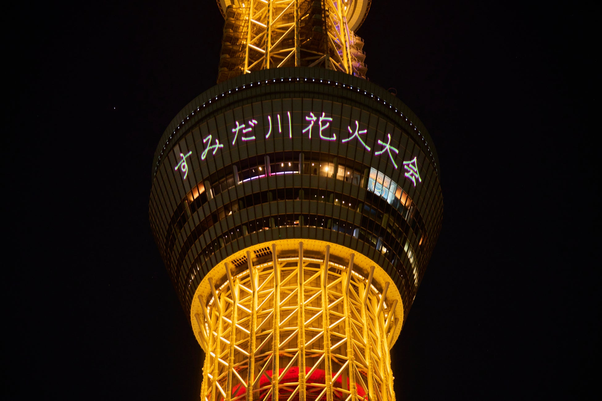 東京スカイツリー(R)では隅田川花火大会に合わせて特別ライティング点灯、レーザーマッピング演出を実施