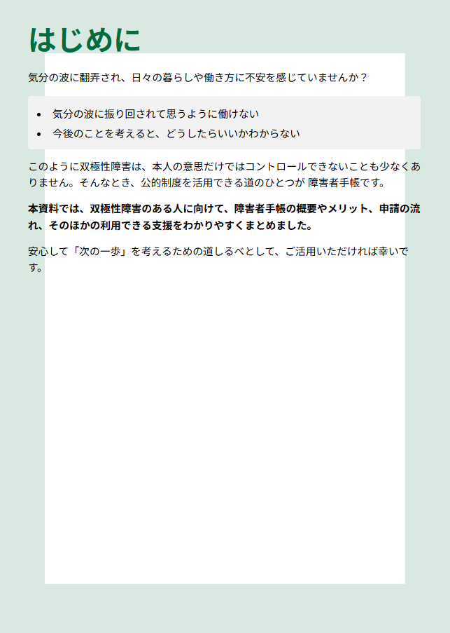 本資料では、双極性障害のある人に向けて、障害者手帳の概要から取得するメリット、具体的な申請方法までを、わかりやすく解説しています。