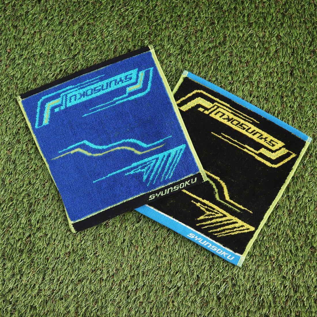 シューズのデザインの世界感をそのままタオル全体に落としこみシャープ感・スポーティーなラインを意識してスピード感が出るようデザイン。