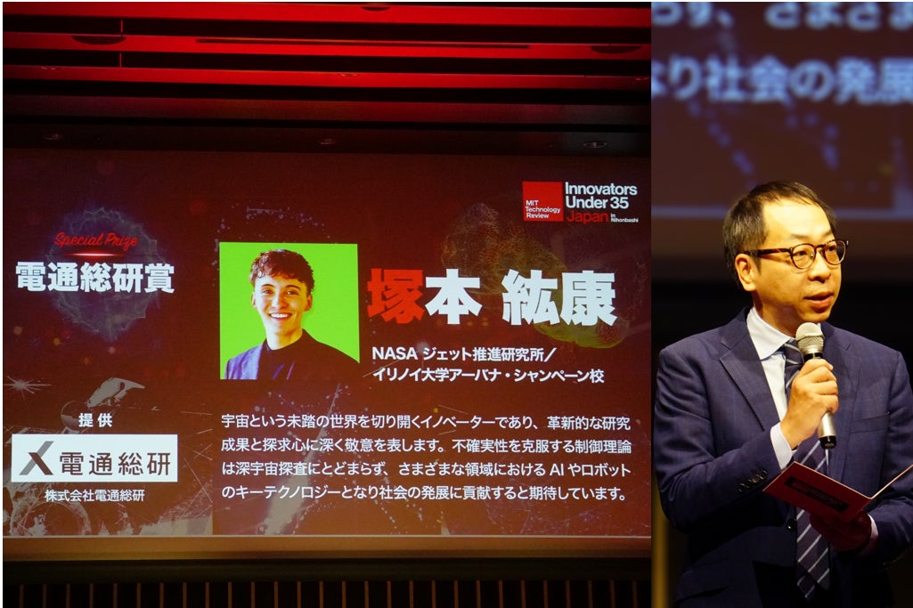 テクノロジーで企業と社会の進化を実現する株式会社電通総研(本社:東京都港区、代表取締役社長:岩本 浩久、以下「電通総研」)は、2024年11月20日(水)に開催されたMITテクノロジーレビュー[日本版](運営:株式会社角川アスキー総合研究所、本社:東京都文京区、代表取締役社長:加瀬 典子)が主催する「Innovators Under 35 Japan 2024(イノベーターズ アンダー 35 ジャパン 2024)(https://www.technologyreview.jp/s/348608/the-winners-of-innovators-under-35-japan-2024-have-been-announced/)」において、特別賞として「電通総研賞」をNASA ジェット推進研究所 客員研究員/イリノイ大学アーバナシャンペーン校 助教授の塚本 紘康氏へ授与したことをお知らせします。