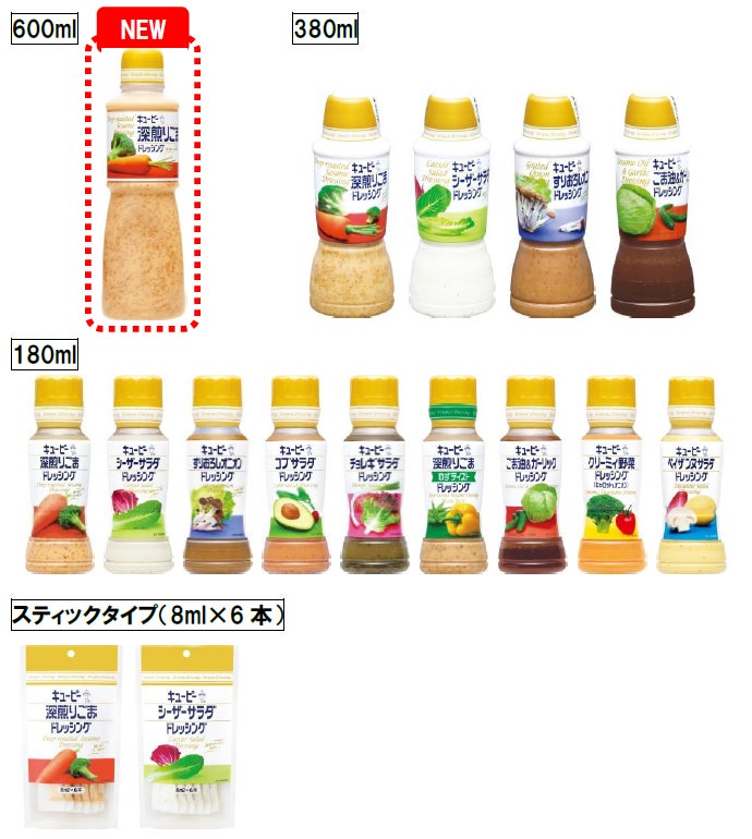 中でも深煎りごまドレッシングは汎用性が高く、自社の調査によると年々サラダ以外のメニューに使われるシーンが増えています。これらの背景から、既存の180ml、380ml、スティックタイプに加え、普段のサラダにたっぷり使えて、これ1本でサラダ以外のメニューにも幅広く使える、新容量600mlを新たに発売します。