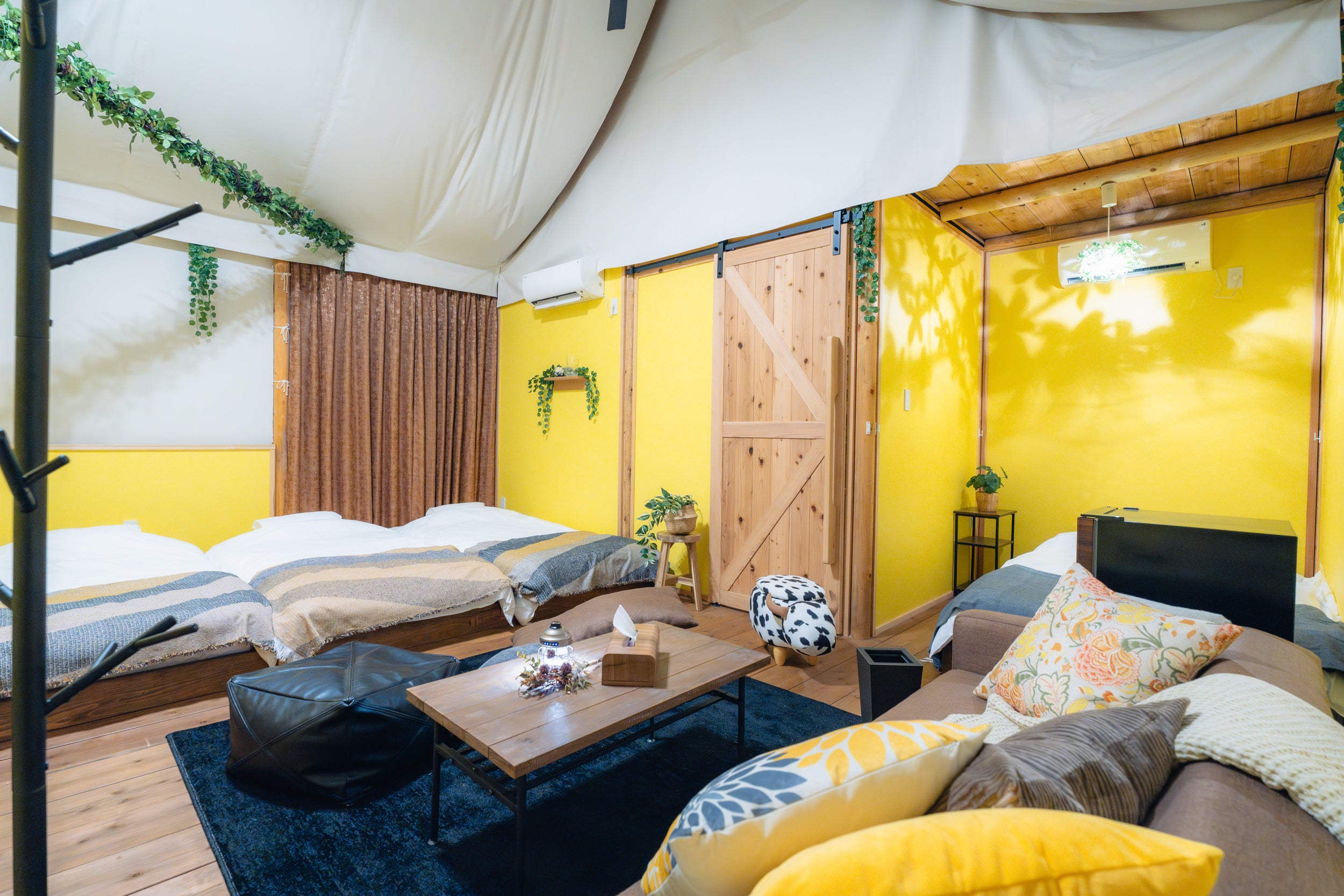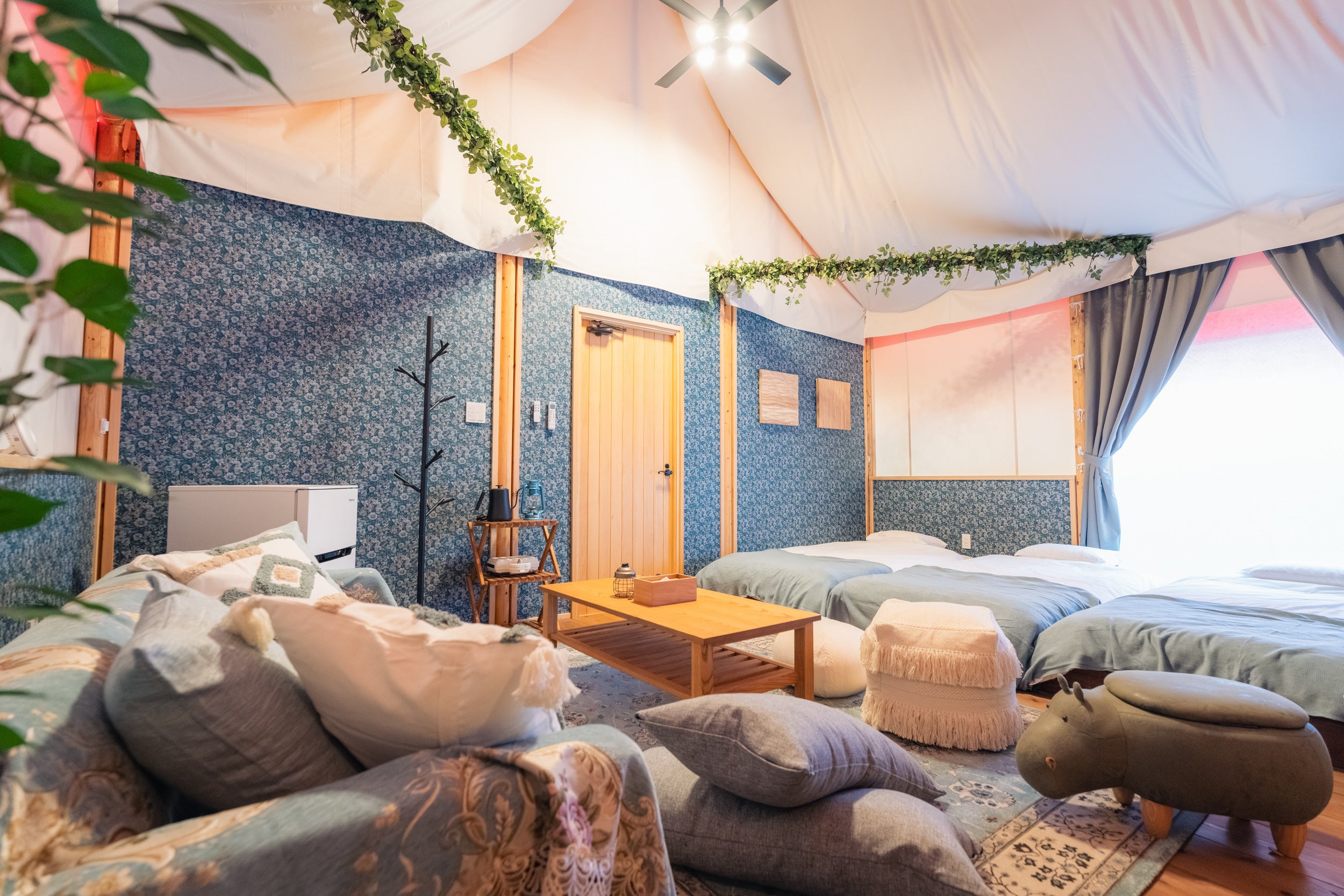 ホテルライクな内装は各お部屋ごとにテーマカラーを設定した快適なテントです。静かな山で鳥のさえずりに耳を澄ませる。そんな優雅な1日をお過ごしいただけるグランピング体験を完全無料でご案内。