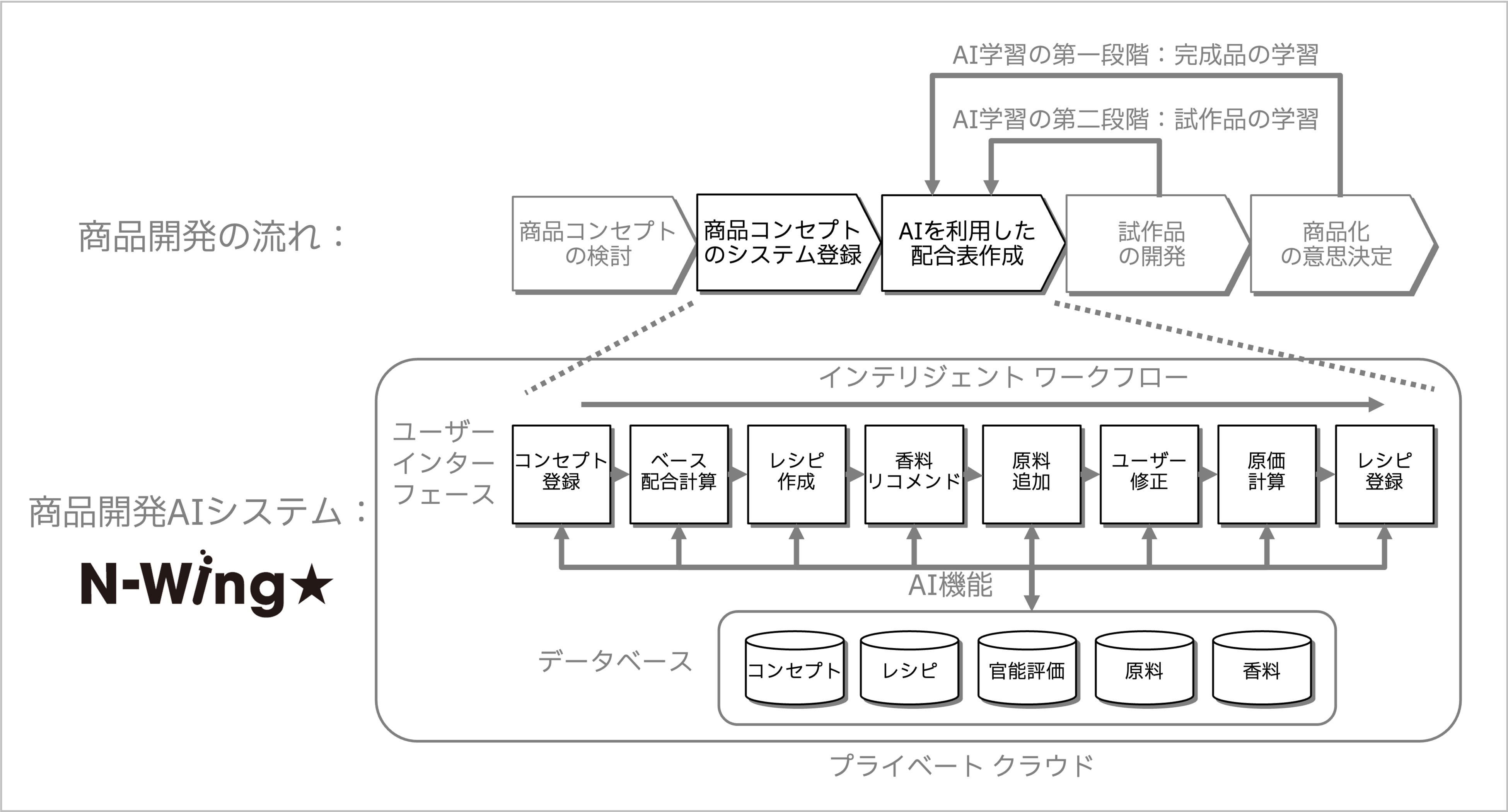 これまでサッポロビールのRTD新商品開発では、サプライヤーから得た原料情報を元に、過去のレシピ等を参照し、長年経験している開発者から情報収集も行うなど、時間と労力をかけて試行錯誤を繰り返して取り組んでいました。本システムは2021年11月よりテスト運用を開始(注2)し、本格実装に向けて協議・検証を続けてきましたが、このたび実装した「N-Wing★」は、これまで商品化した約170商品で検討した配合(約1,200種)や原料情報(約700種)を含むレシピを学習していて、新商品のコンセプトや必要な情報を入力すると、瞬時に目標とする配合の骨格をもとに原料の組合せ、各原料が商品全体の中に占める割合(配合量)まで予測し、推奨配合と推奨香料からなるレシピを出力します。開発担当者はこのレシピを参考にして必要な原料を調達し、試作品の開発を行います。「N-Wing★」が提示したレシピは、AIアルゴリズムにより人間では思い浮かばないような配合が創出されることが確認でき、今後も新しい原料・開発情報を繰り返し学習させることでレシピ配合の予測精度向上が期待されます。