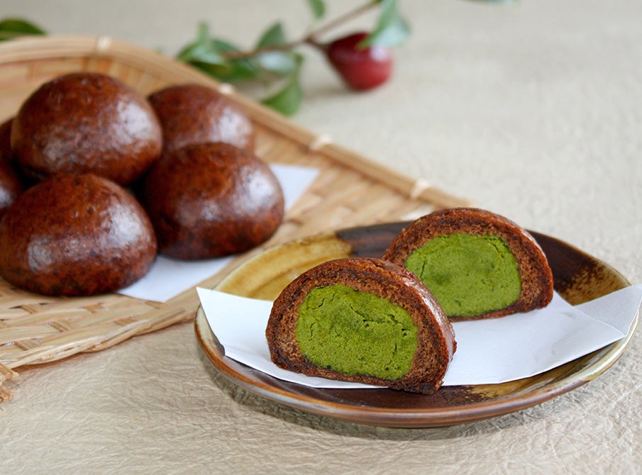表面は黒糖を使用して特製のお饅頭をカリッと仕上げ、中には、抹茶の香りと旨みを凝縮した濃厚な抹茶餡がぎっしり。